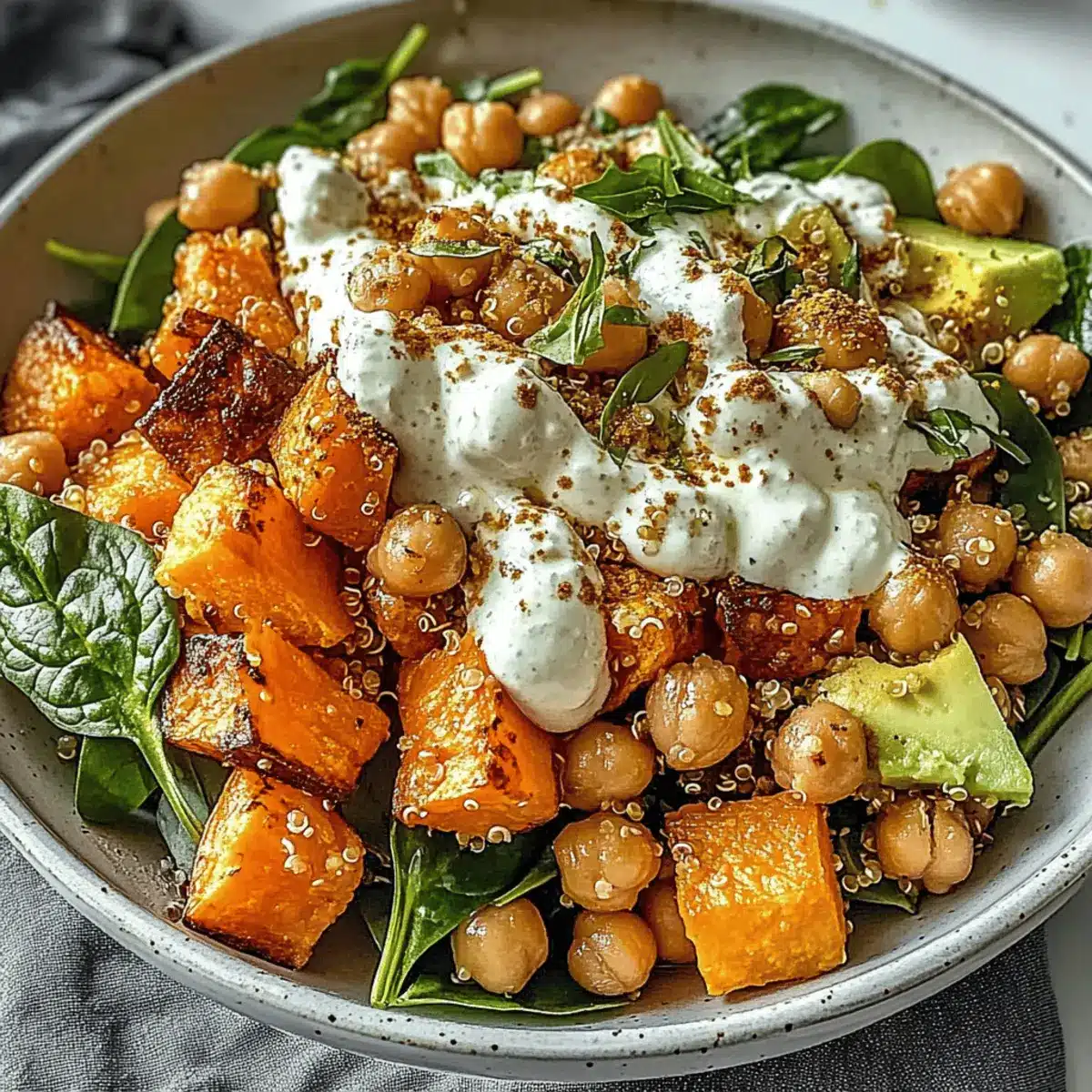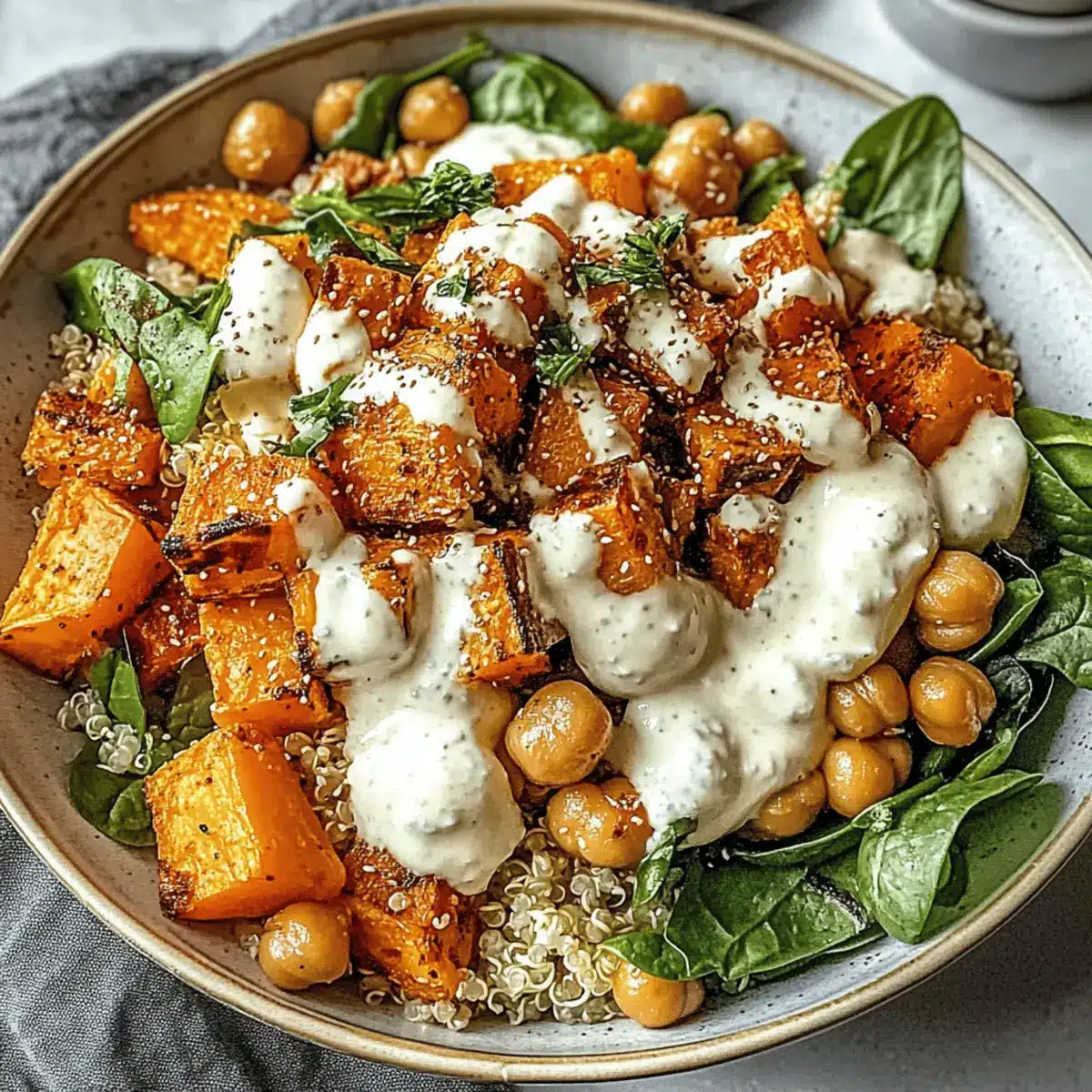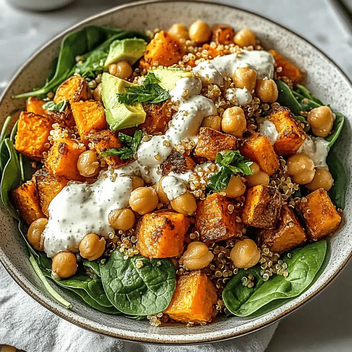 - Assemble by layering quinoa, sweet potatoes, chickpeas, spinach, avocado, and tahini sauce.