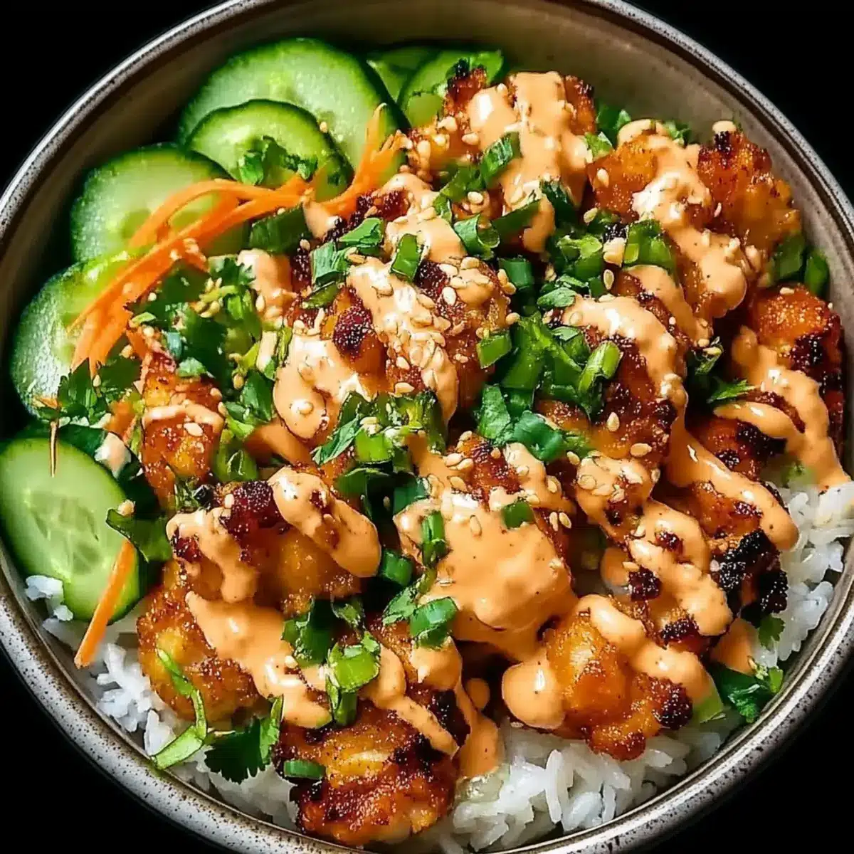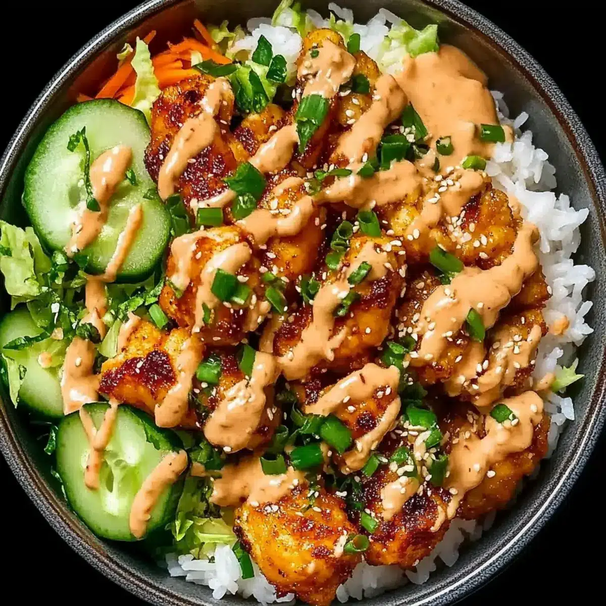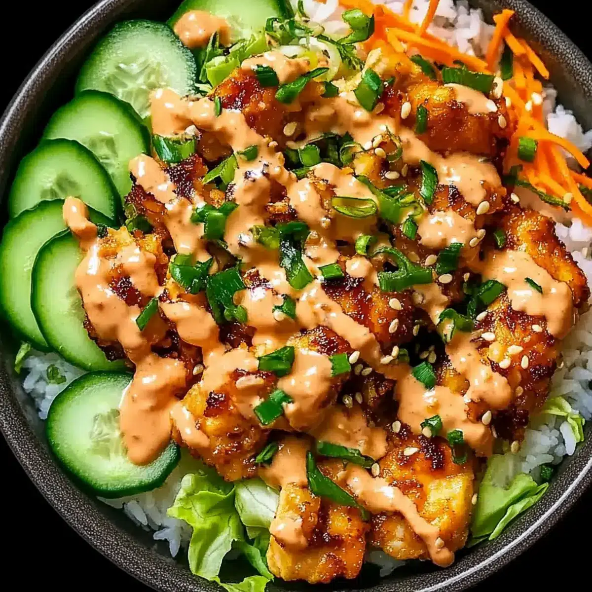 In a serving bowl, start by adding a generous scoop of fluffy jasmine rice as the base. Top it with the crispy fried chicken pieces, creating an appealing layer. Next, add shredded lettuce, diced cucumber, shredded carrots, and a sprinkle of chopped green onions. These fresh elements add color and crunch, making your Bang Bang Chicken Bowl even more inviting.