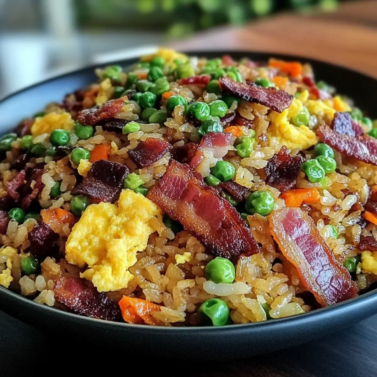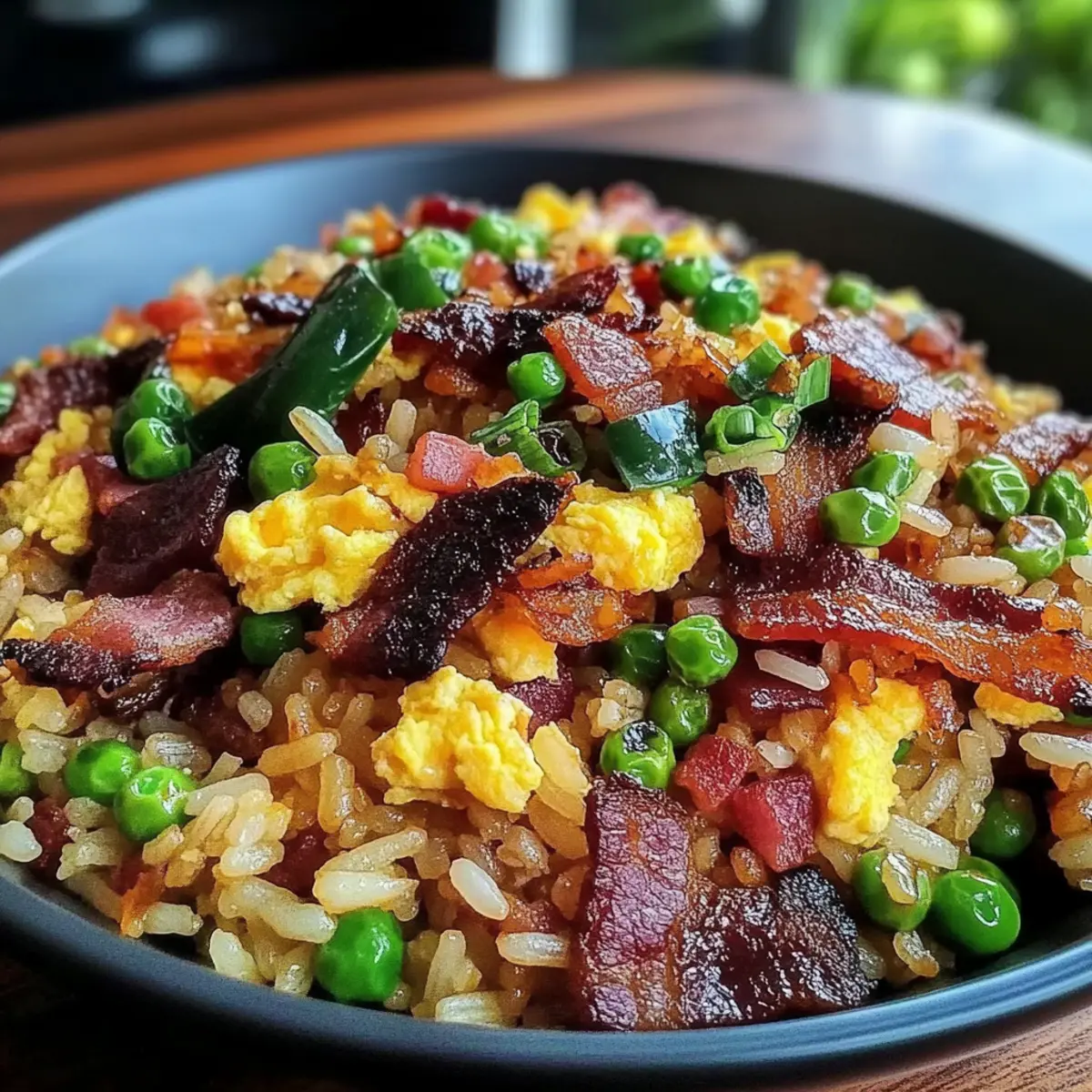 Finally, sprinkle in finely chopped green onions for a fresh touch just before serving. Stir them in gently and remove the skillet from heat. Plate the savory breakfast fried rice while it’s hot, allowing you to savor every mouthwatering bite filled with fluffy rice, crispy bacon, and vibrant vegetables.