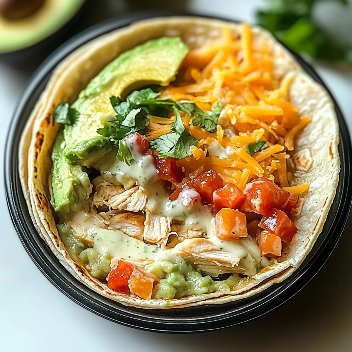 - Spread ranch mixture on each tortilla, layer with chicken, mashed avocado, shredded cheeses, lettuce, tomatoes, and cilantro.
