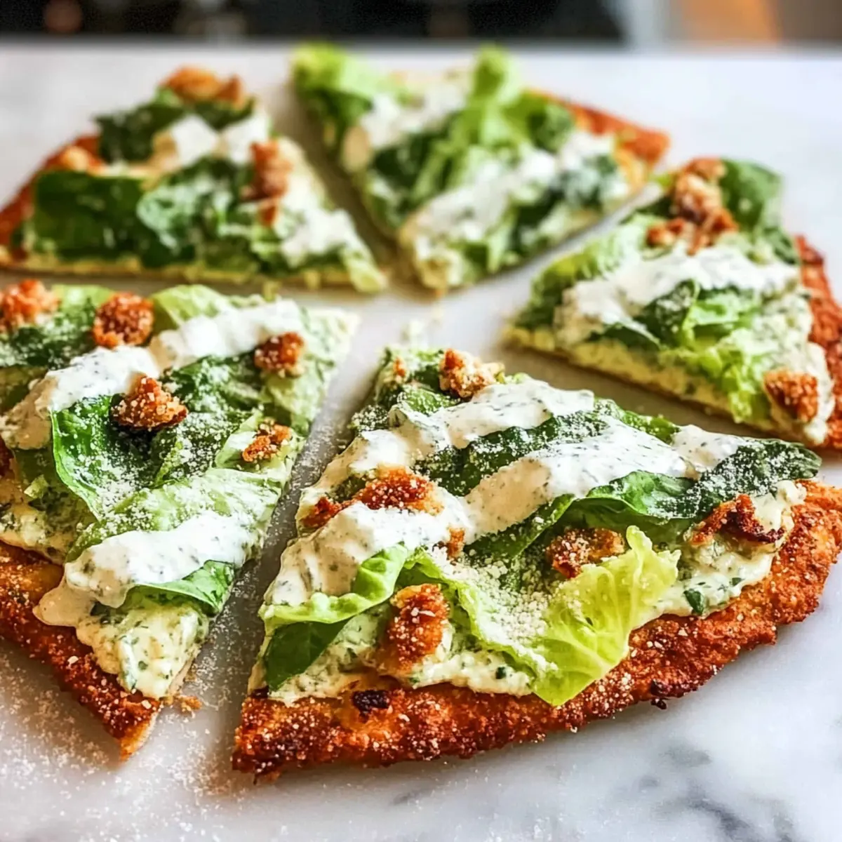 Store the chicken crust and Caesar salad separately in airtight containers in the fridge for up to 3 days. This method maintains the crust’s crispiness, allowing you to enjoy your Chicken Crust Caesar Salad Pizza without it getting soggy.