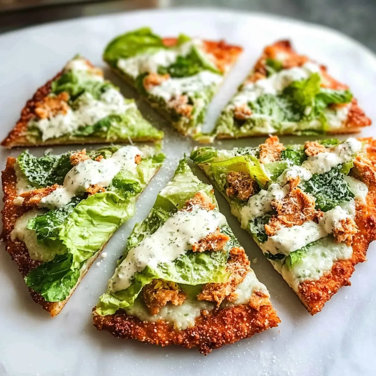 Slice your Chicken Crust Caesar Salad Pizza into wedges or squares, and serve immediately! The contrast of the warm, crispy chicken crust with the cool, fresh salad on top is simply irresistible. Gather your loved ones and enjoy this innovative, protein-packed meal for a satisfying dinner that feels indulgent yet healthy.