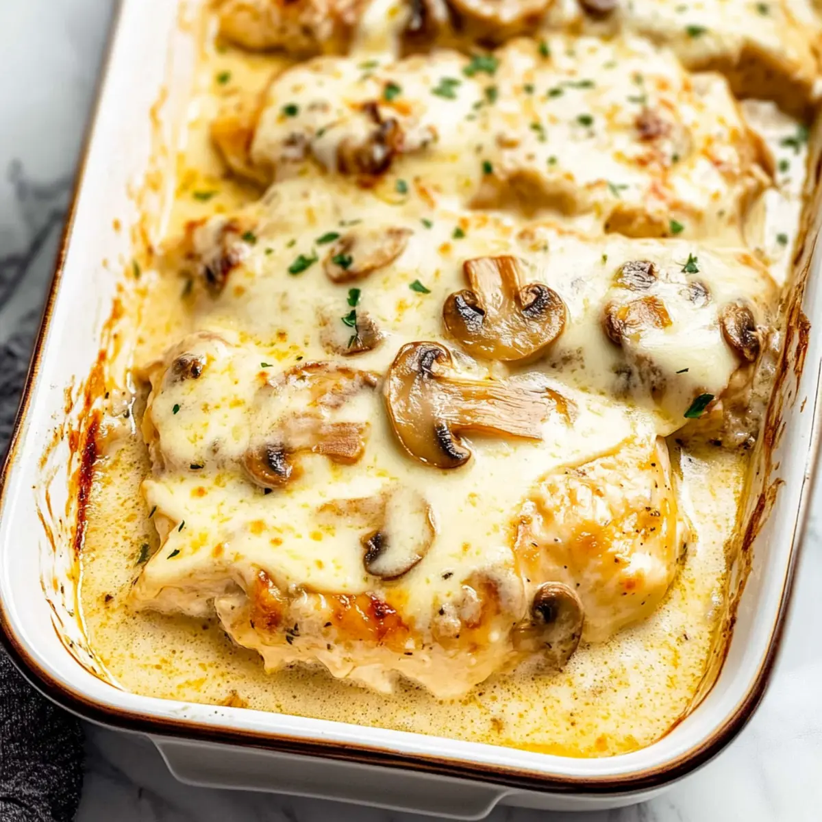 - Pour the creamy sauce over the chicken and mushrooms in the casserole dish, then top with slices of Muenster cheese.