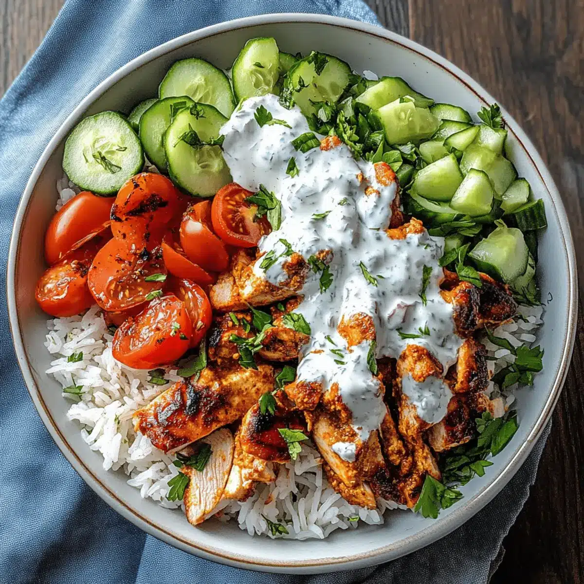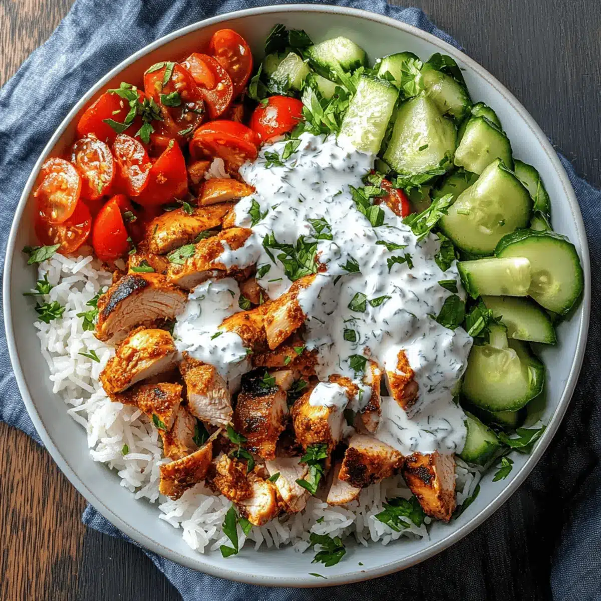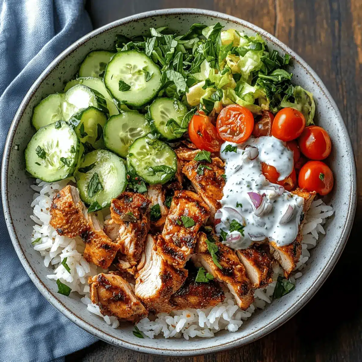 - Assemble Bowls: Add warm rice to bowls, layer with chicken, top with vegetables, drizzle garlic yogurt sauce, and add optional toppings.