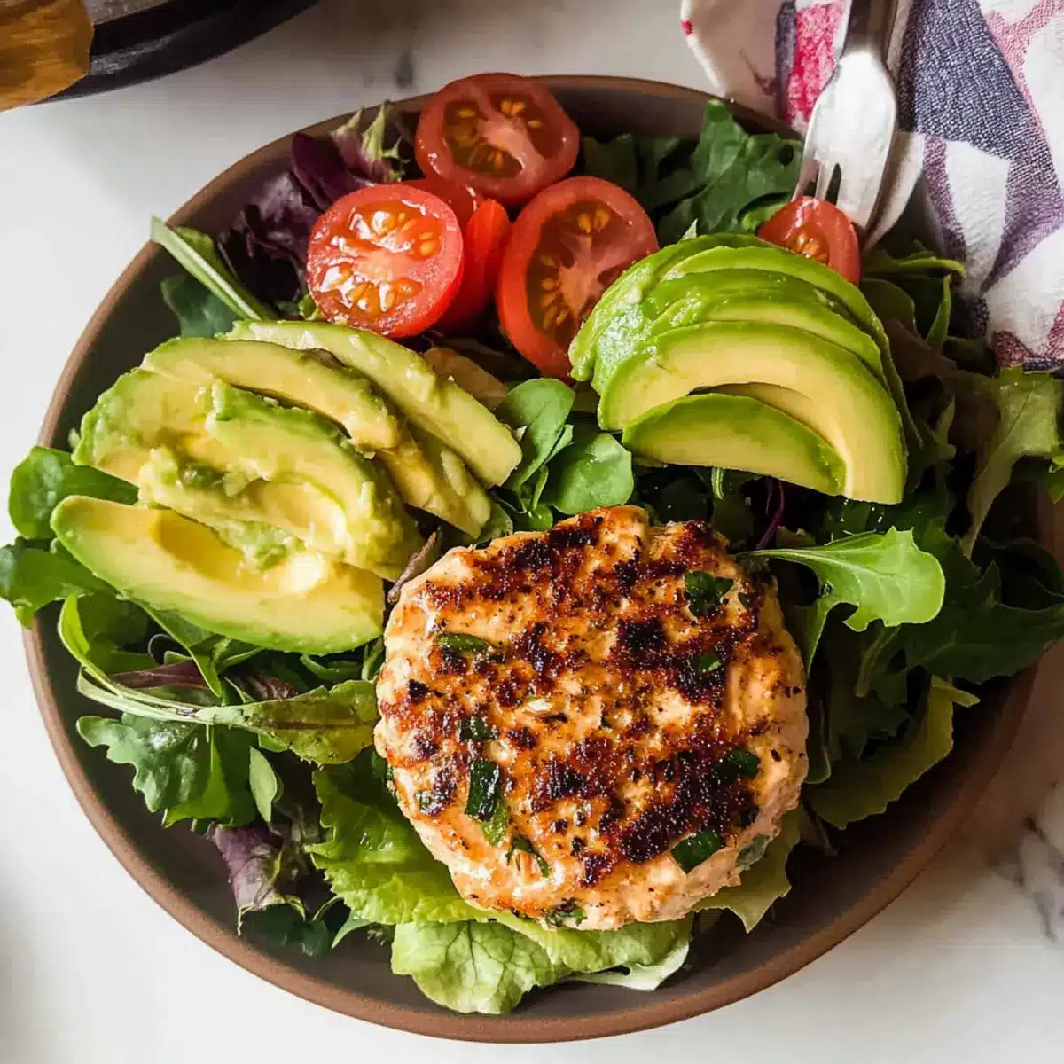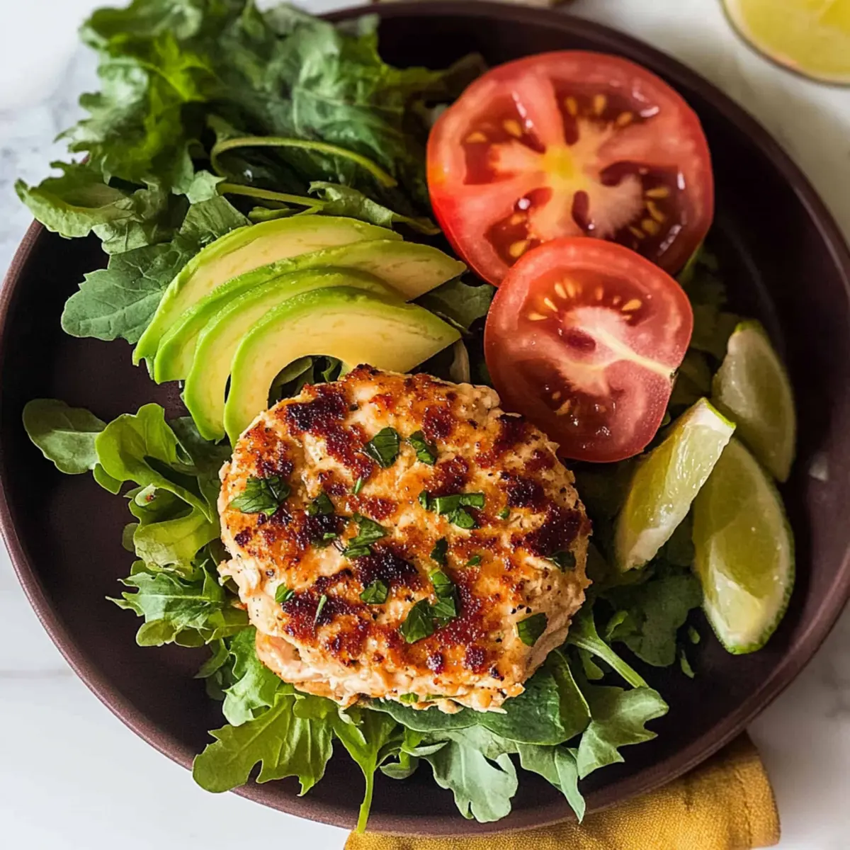 - Serve cooked patties on top of mixed greens, topped with avocado and tomato slices, and garnish with cilantro and lime juice.