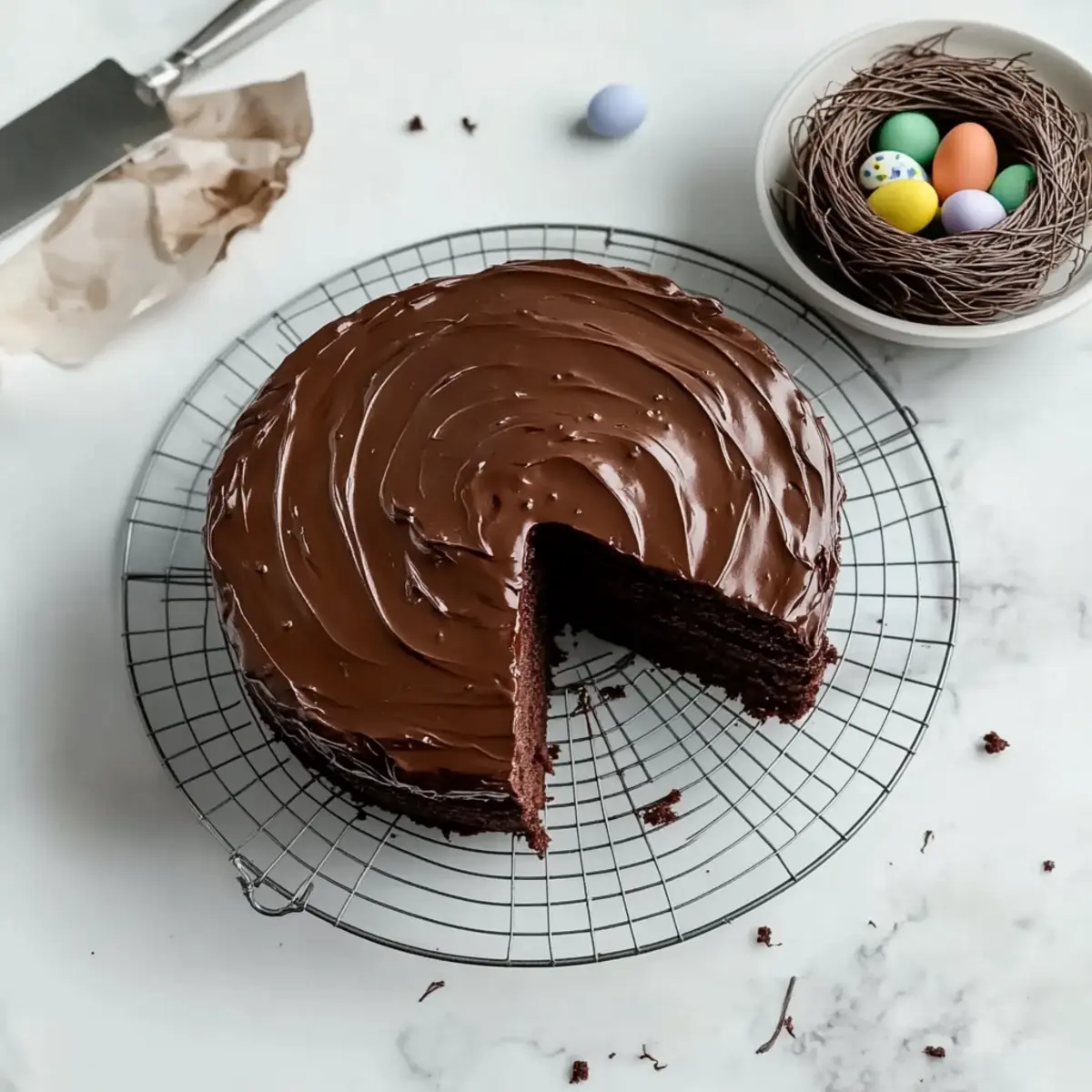 Avoid Overmixing: When combining wet and dry ingredients, mix just until combined; overmixing can lead to a dense cake rather than the light texture desired in this Chocolate Easter Egg Nest Cake.
