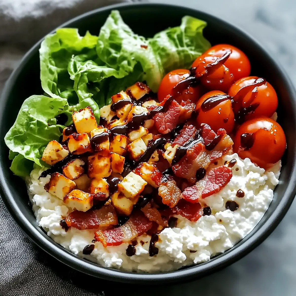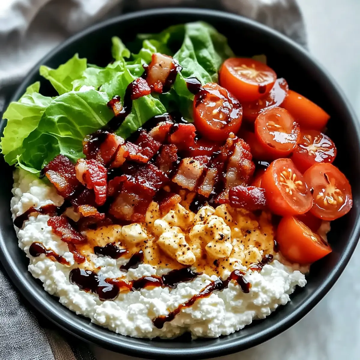 Take 1 tablespoon of balsamic glaze and artfully drizzle it over the entire bowl. This sweet-tangy glaze enhances the flavors, tying together all the components of your Creamy BLT Cottage Cheese Bowl. As you drizzle, pay attention to how it beautifully coats the toppings, creating a glossy finish that is both inviting and delicious.