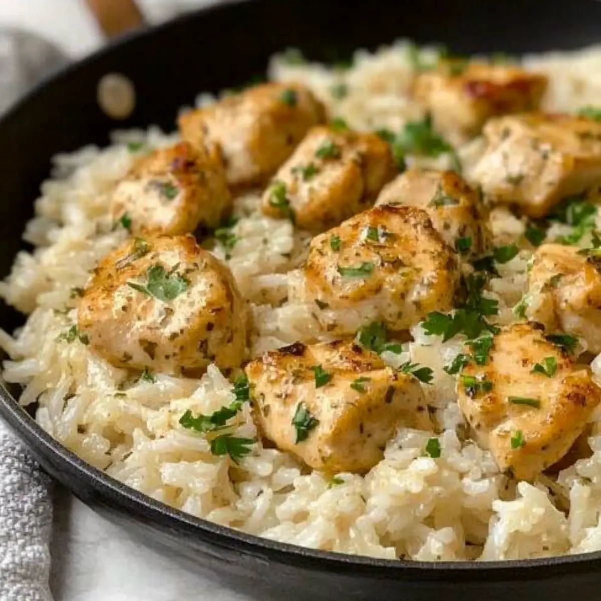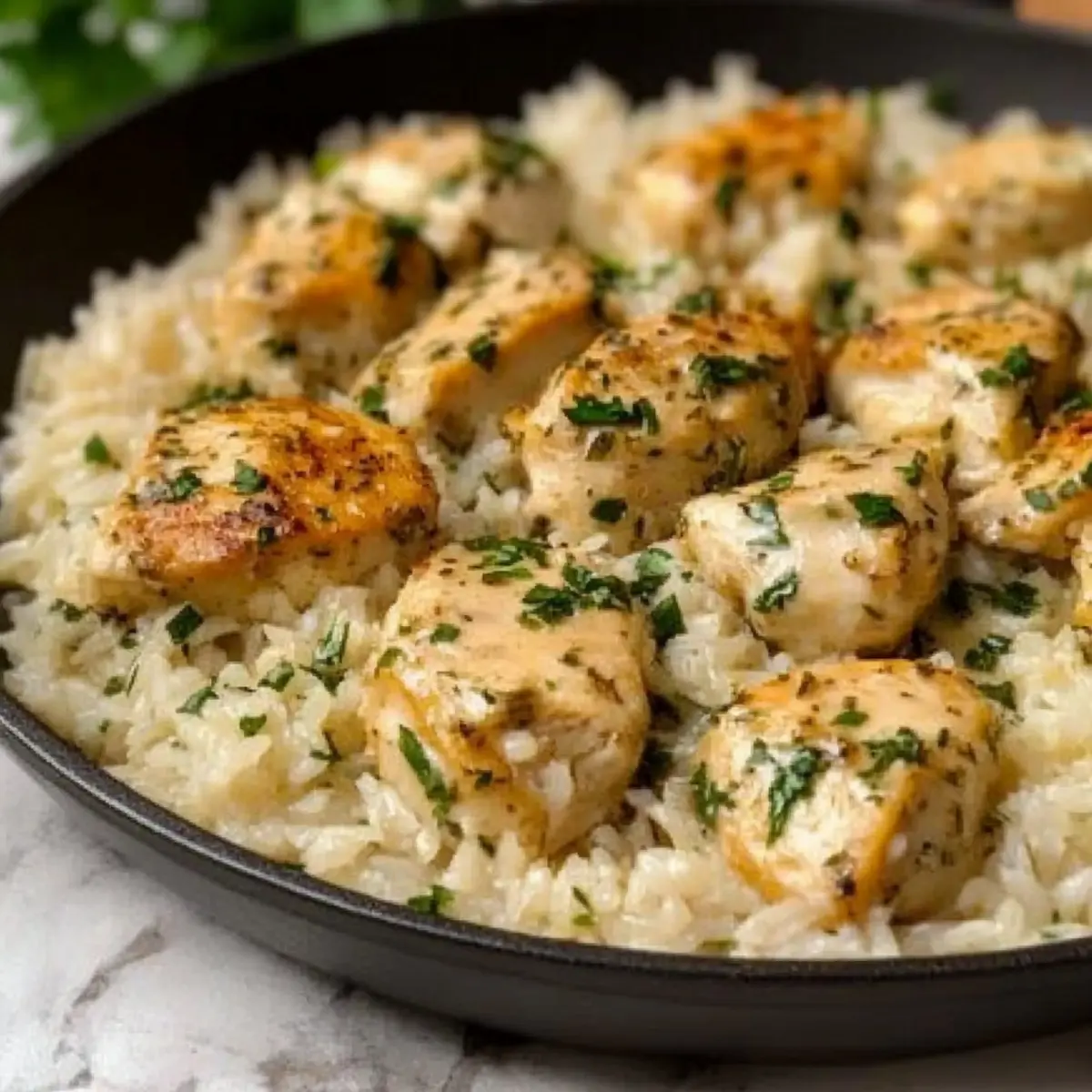 Once done simmering, remove the skillet from heat and let it sit for a few minutes. Garnish your Creamy Herb Chicken & Basmati Rice with freshly chopped parsley and a sprinkle of lemon zest for a burst of freshness. Serve warm and enjoy the comforting embrace of this delicious one-pan meal!