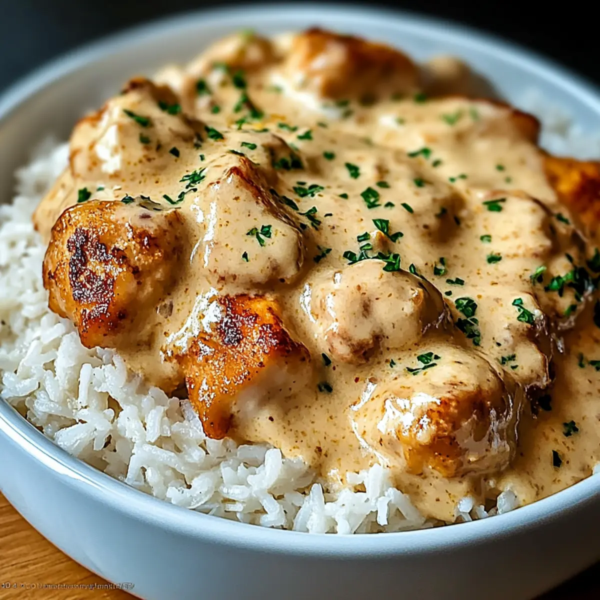 - Serve with a scoop of rice topped with creamy chicken and sauce. Garnish with fresh herbs if desired.