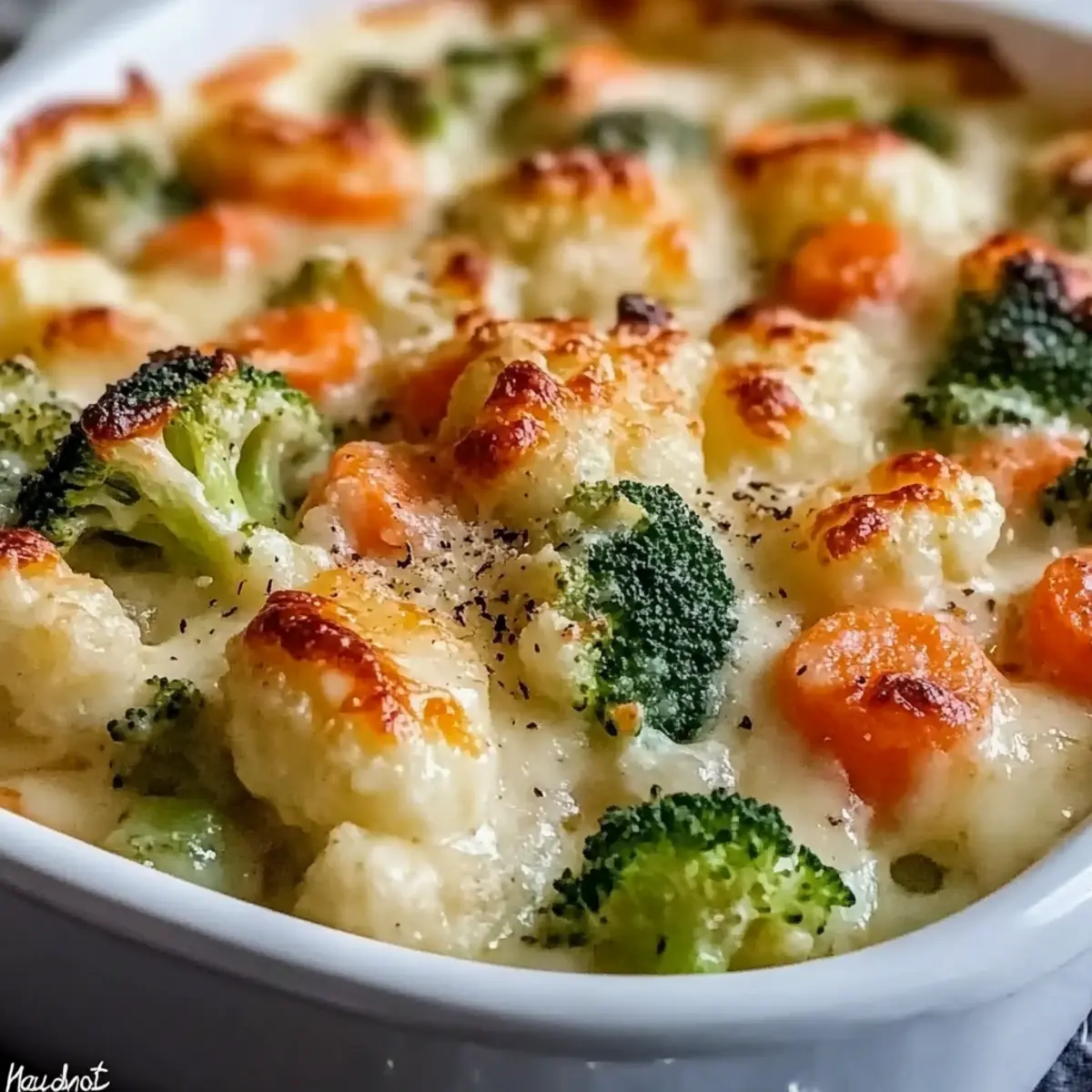 Once thickened, stir in 1 teaspoon of garlic powder, a pinch of ground nutmeg, and salt and black pepper to taste. Lower the heat, then mix in 1 cup of shredded cheddar cheese and ½ cup of grated Parmesan cheese, stirring until the cheeses melt into a velvety sauce. The rich, creamy texture will perfectly complement the vegetables in the casserole.