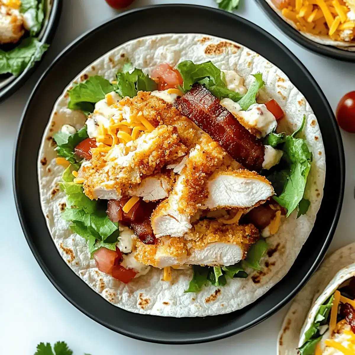 - Lay out tortillas, spread ranch dressing on each, then add shredded lettuce, diced tomatoes, shredded cheddar cheese, crispy chicken, and crumbled bacon.