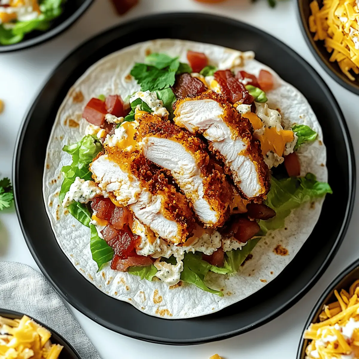 Lay out your flour tortillas on a clean surface and spread a generous layer of ranch dressing onto each tortilla. Start with the shredded lettuce, followed by diced tomatoes, shredded cheddar cheese, and just-fried crispy chicken. Add the crumbled bacon on top, ensuring every wrap gets a taste of its smokiness for a flavor-packed experience.