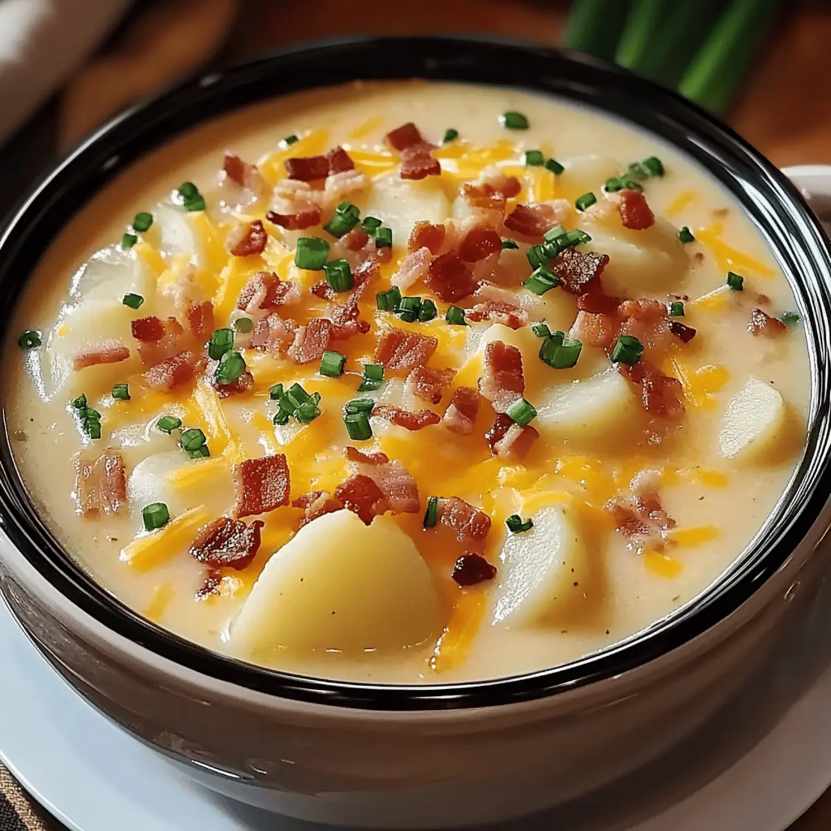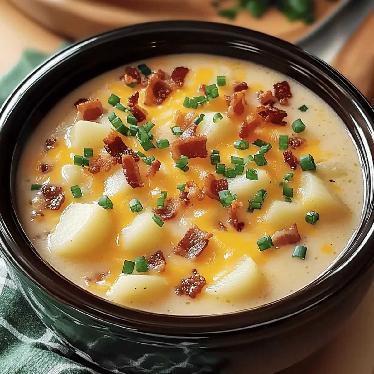 - Ladle the soup into bowls and garnish with extra cheese, bacon bits, or green onions.