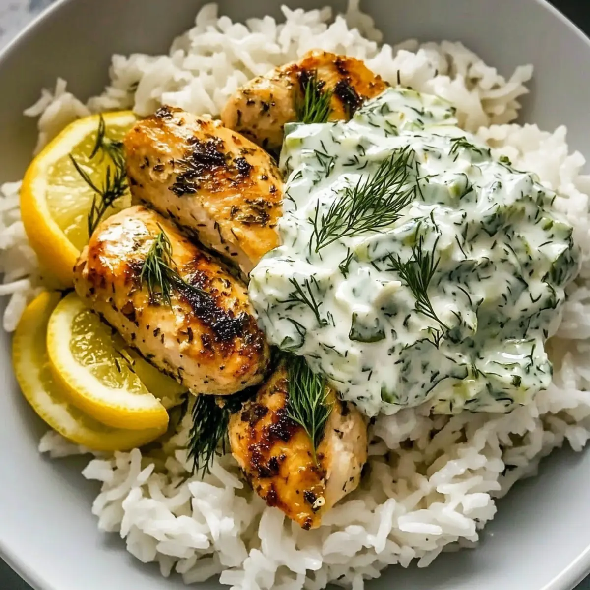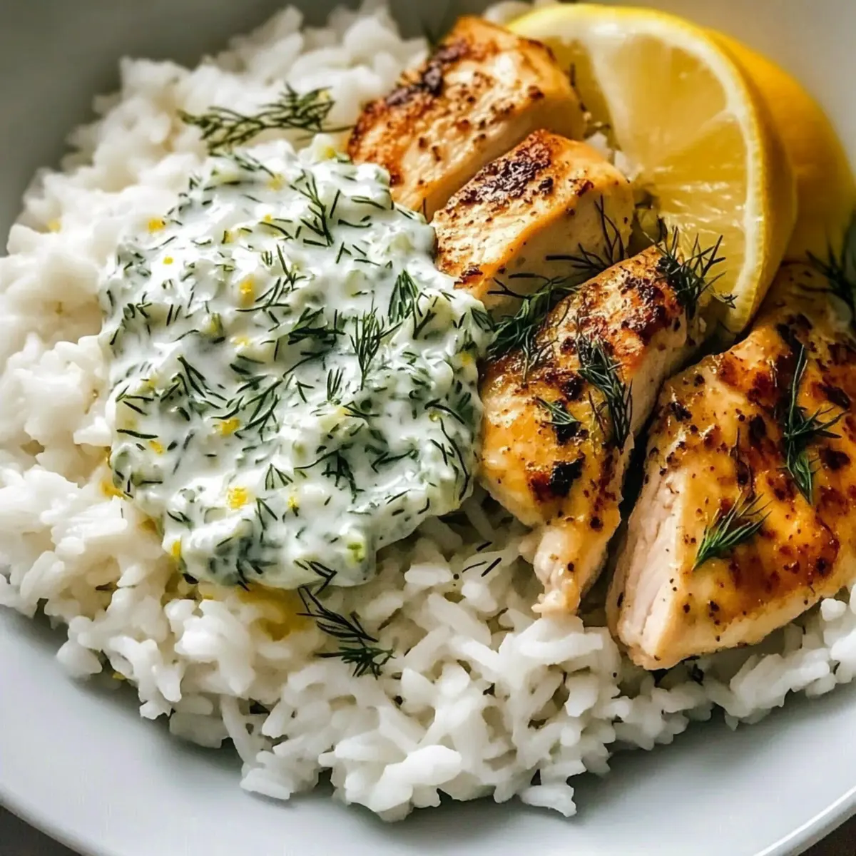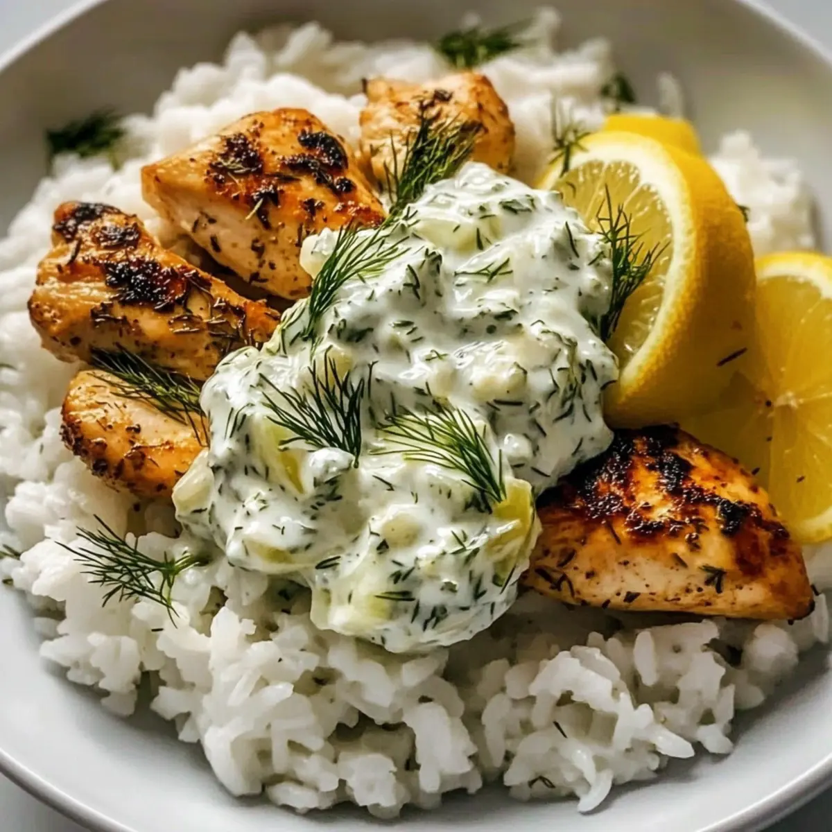 - Spoon tzatziki sauce evenly over the chicken and rice, ensuring complete coverage.