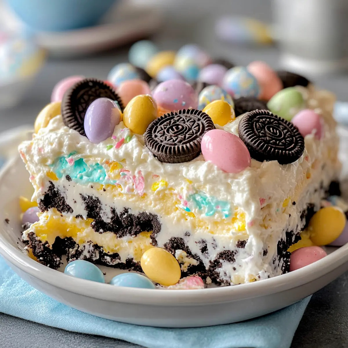 - Layer the remaining crushed Oreos over the pastel candies, followed by the rest of the cream mixture.