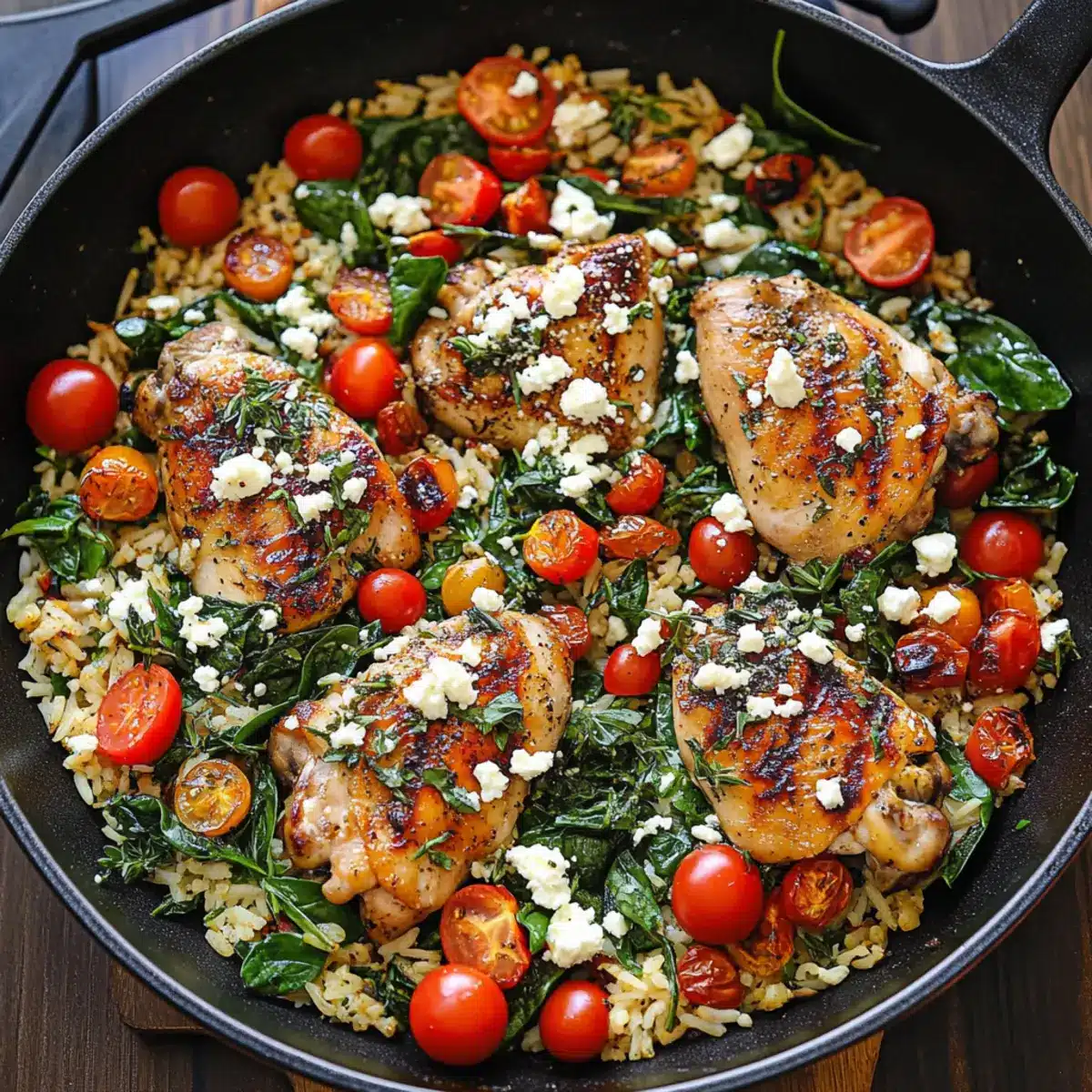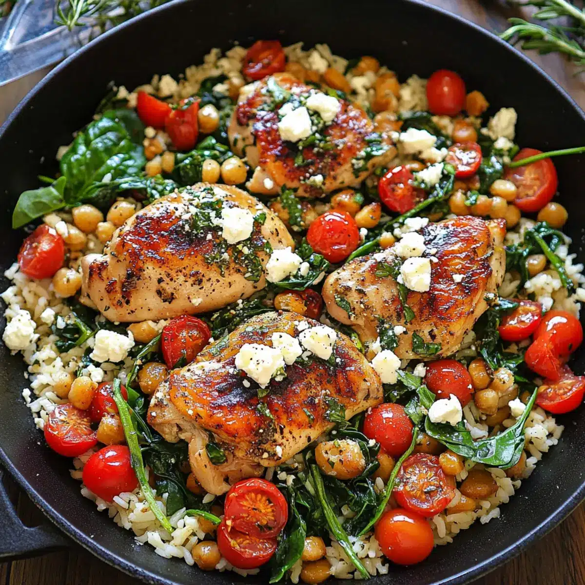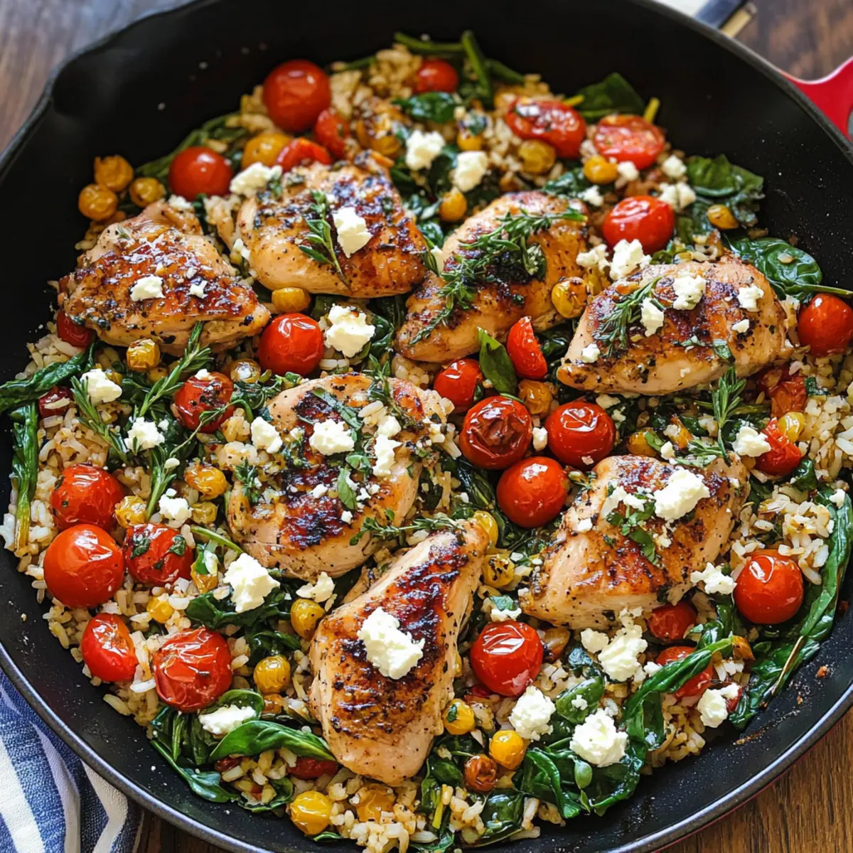 - Fold half of the feta into the rice mixture, return chicken to skillet, and warm for 3 minutes. Top with remaining feta.
