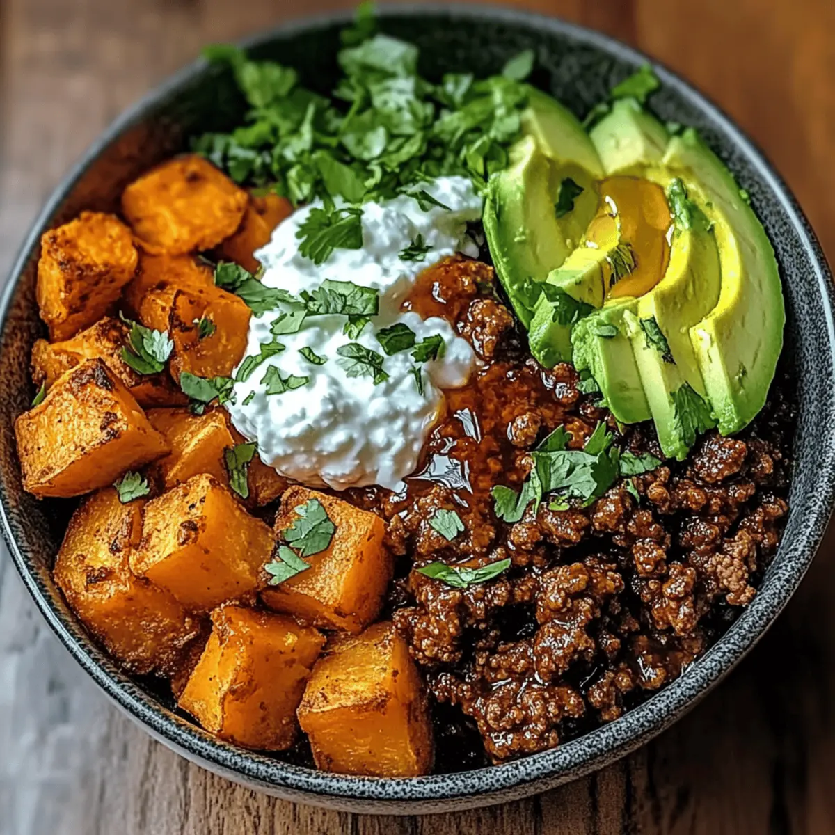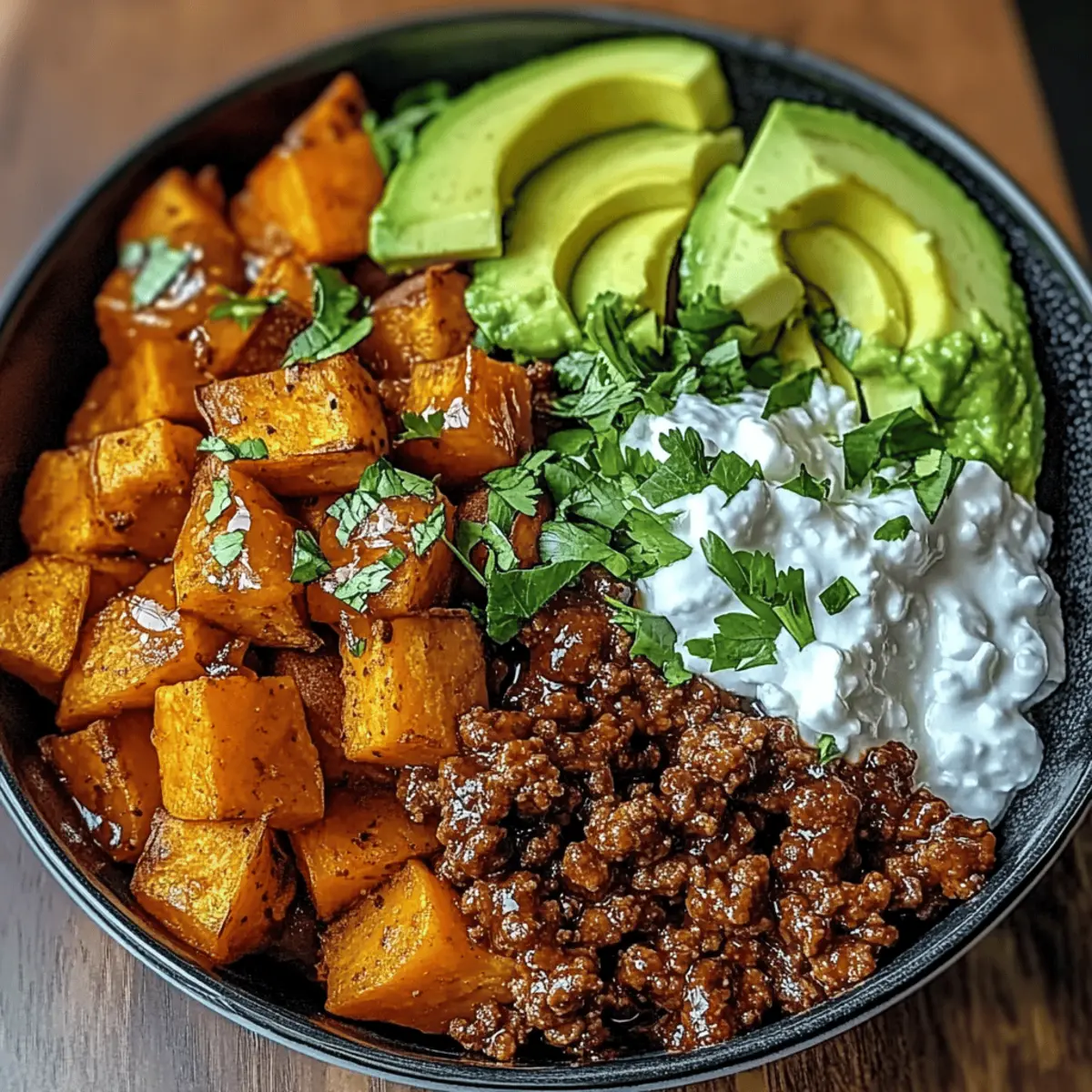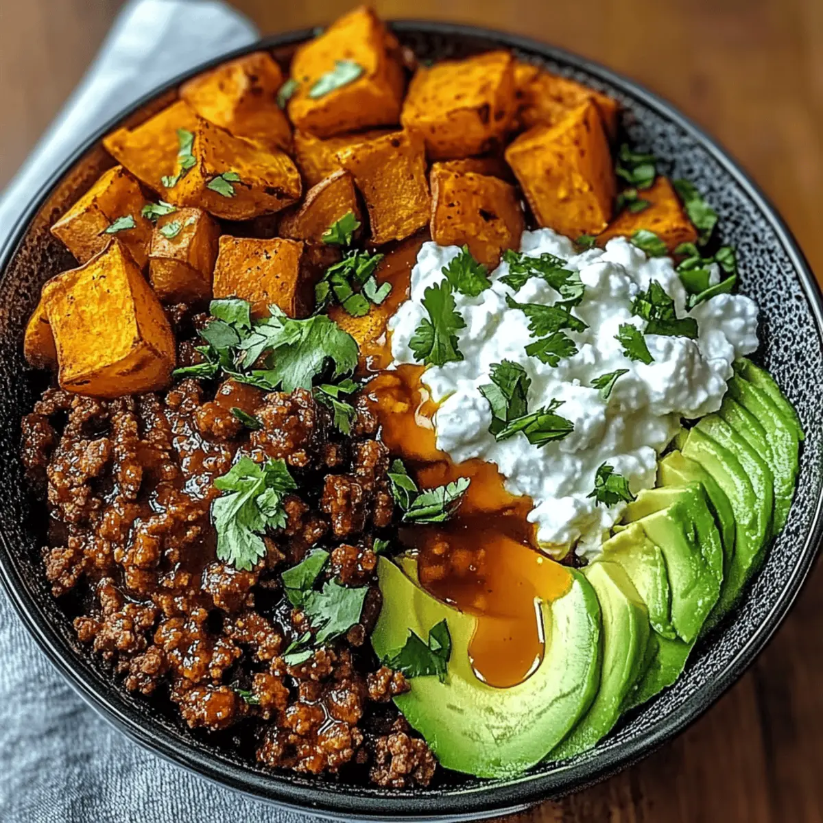 - Assemble the bowls by layering roasted sweet potatoes at the bottom, then spooning the taco-seasoned ground beef over the potatoes.