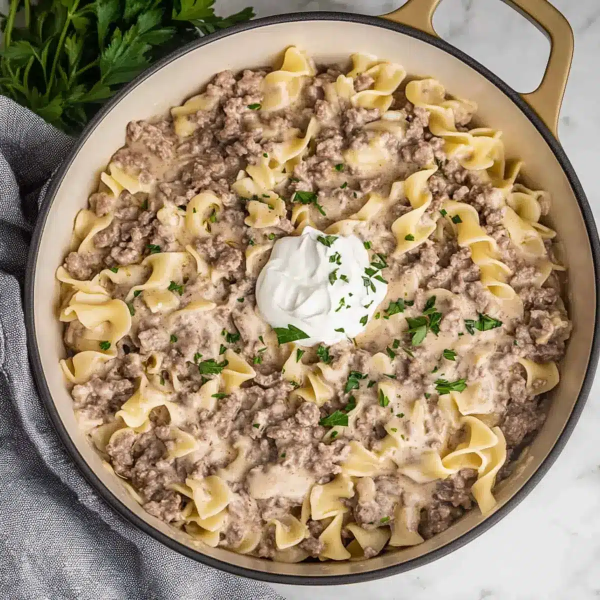 You can easily prepare components of this Hamburger Stroganoff up to 24 hours in advance, making it a fantastic option for busy weeknights. Cook the egg noodles and toss them with a bit of olive oil to prevent sticking, refrigerating them until ready to use. Brown the ground beef and store it separately in an airtight container for up to 3 days. The sauce can also be made ahead by preparing the roux and then adding in the beef broth and milk; just reheat gently before stirring in the sour cream. When you’re ready to serve, simply combine all components in the skillet, heat until warmed through, and enjoy a comforting, delicious meal with minimal effort!