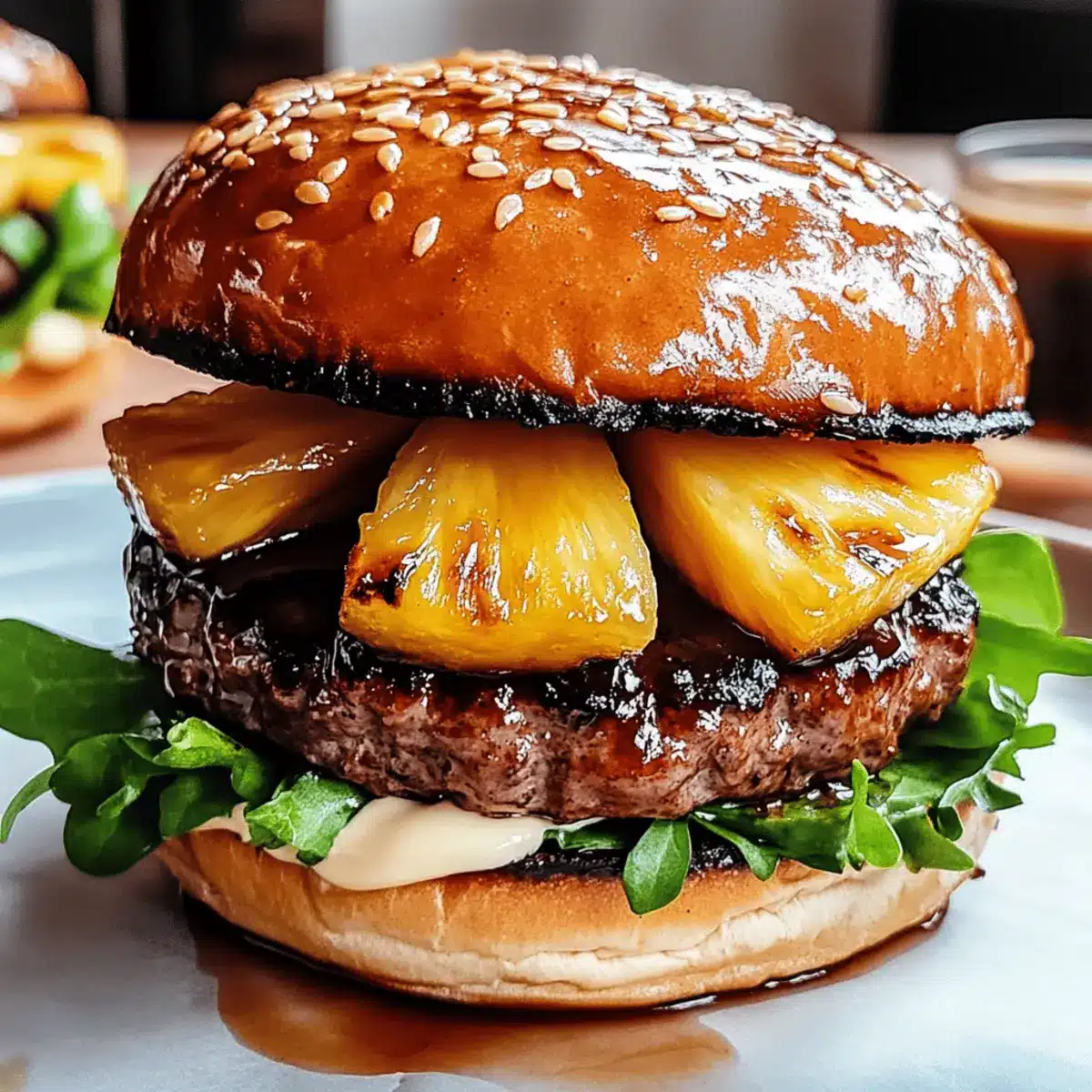 - Assemble burgers by spreading mayonnaise on soft buns, layering with greens, grilled patty, teriyaki sauce, and caramelized pineapple.