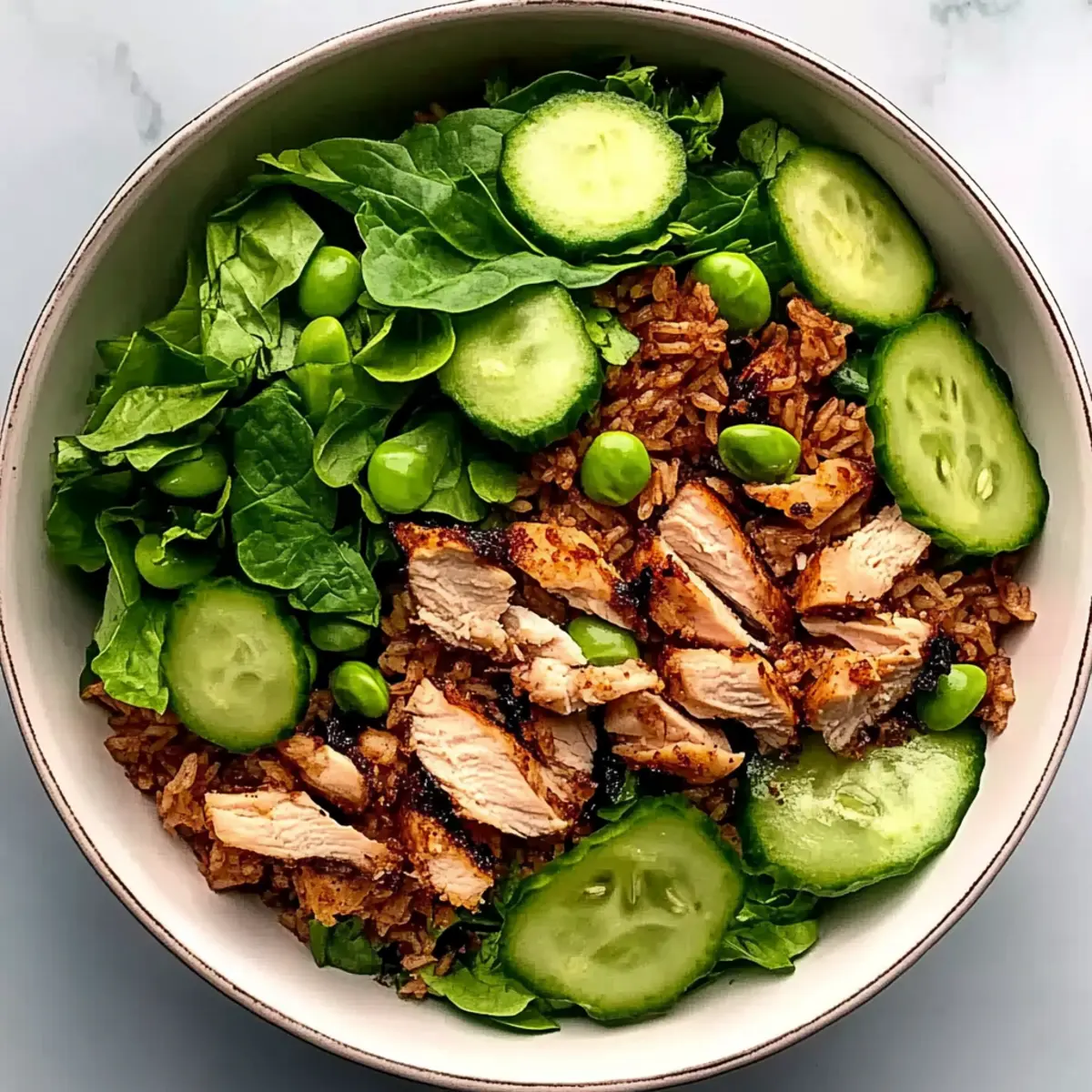 In a large serving bowl, combine the fried chicken, shredded lettuce, sliced cucumbers, chopped mint, spring onions, and edamame beans. Toss gently to mix the ingredients while ensuring the chicken remains intact, creating a colorful, protein-packed base for your High Protein Crispy Rice Salad.