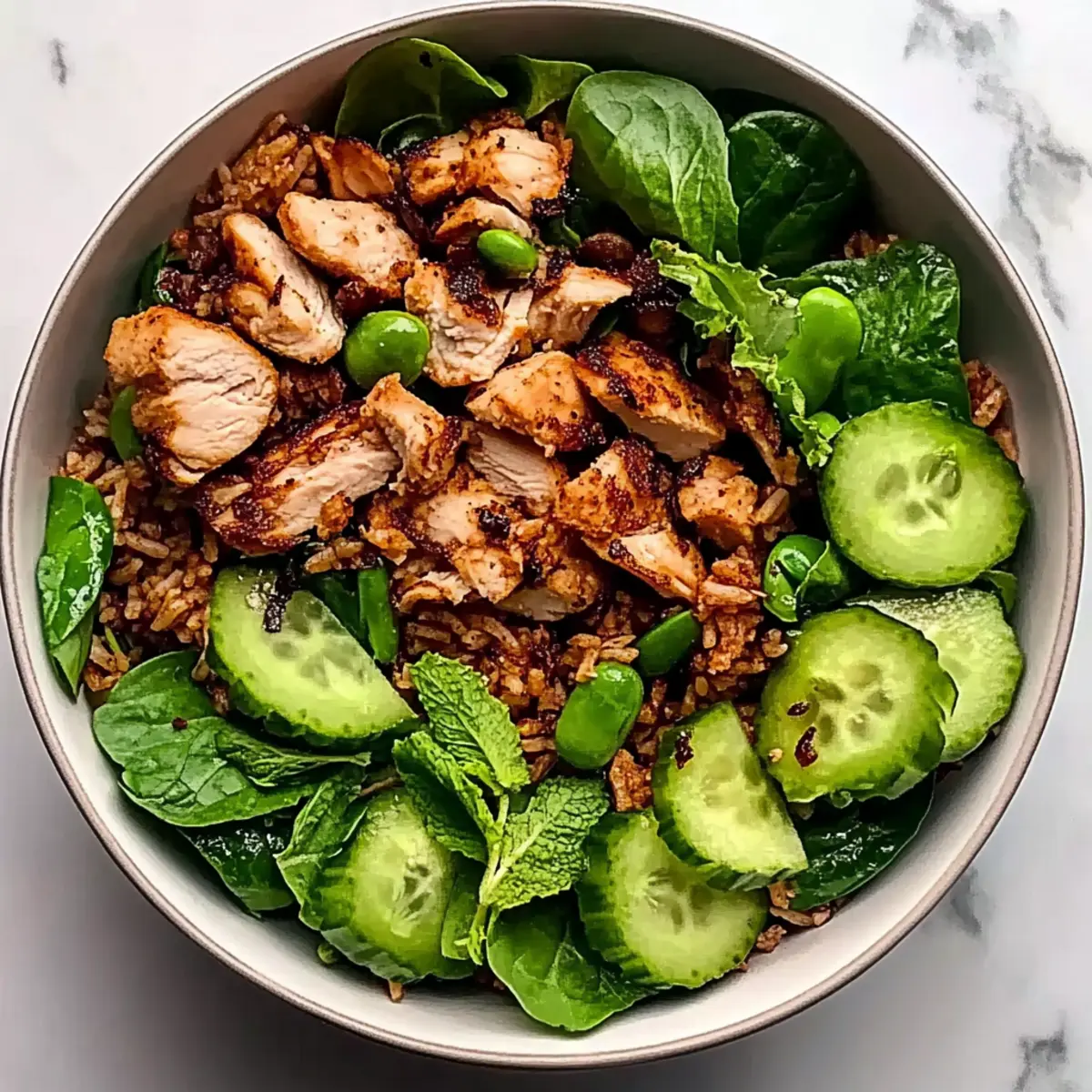 - Step 8: In a large serving bowl, combine fried chicken, lettuce, cucumbers, mint, spring onions, and edamame.