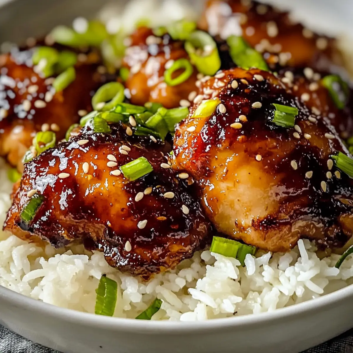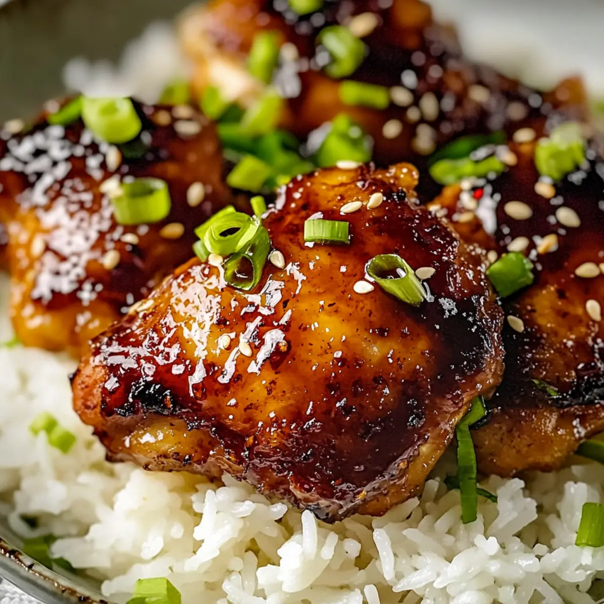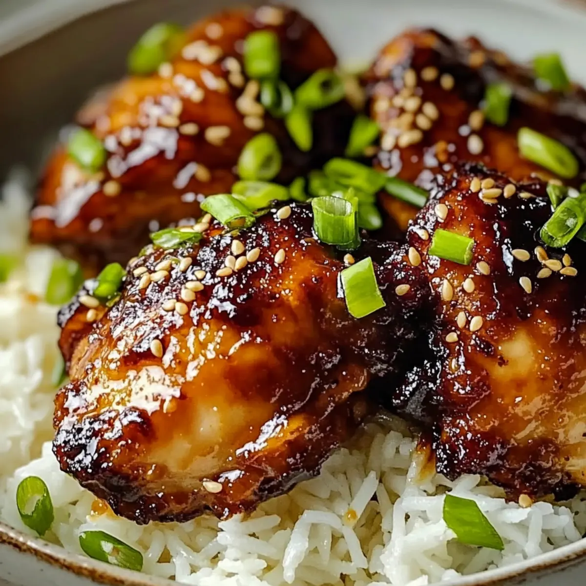 - Serve chicken over jasmine rice, quinoa, or cauliflower rice, garnished with green onions and sesame seeds.