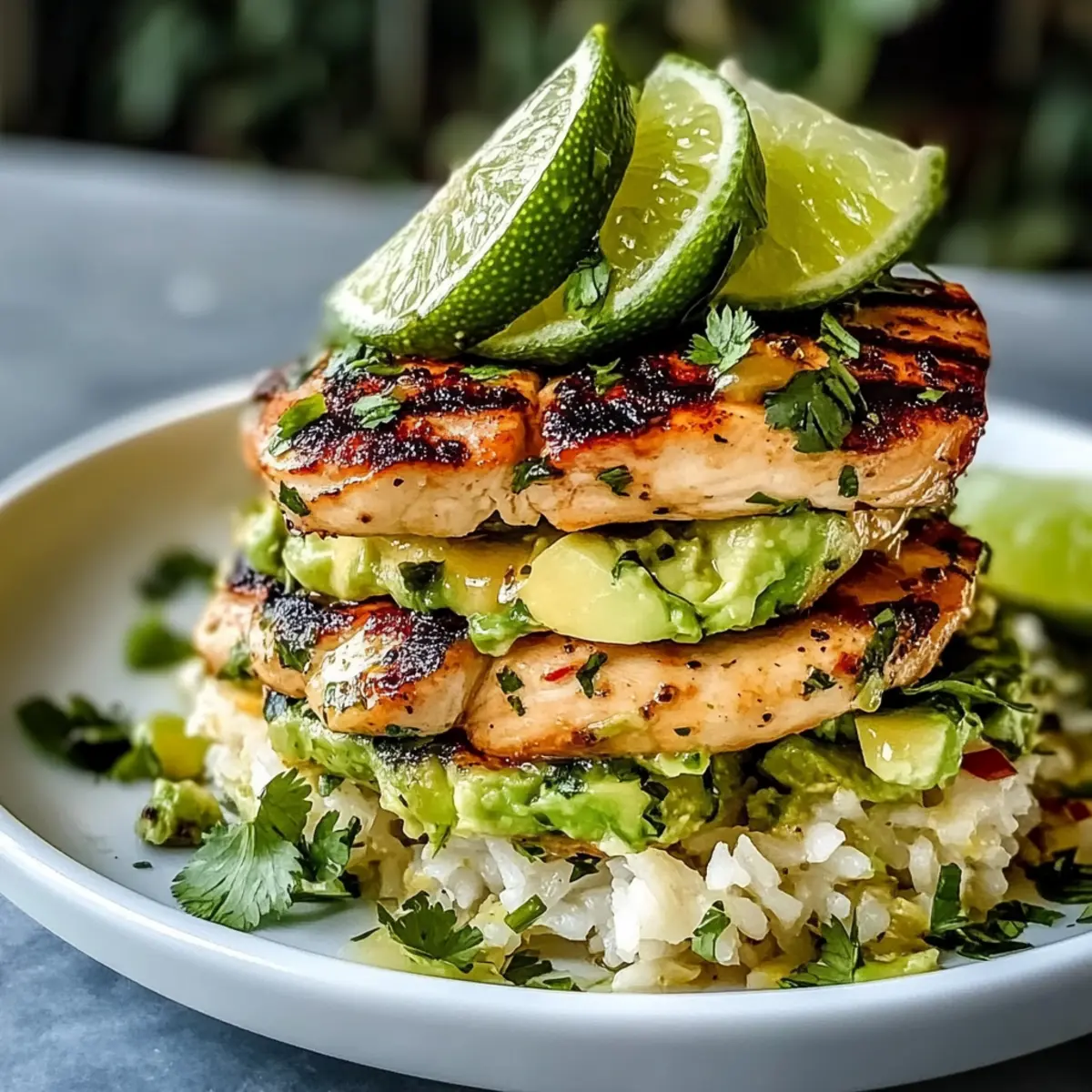 To create a beautiful Honey Lime Chicken Avocado Rice Stack, use a mold if you have one. Begin by layering a generous portion of the creamy avocado rice as the base. Carefully slice the grilled chicken and arrange the pieces on top of the avocado rice.