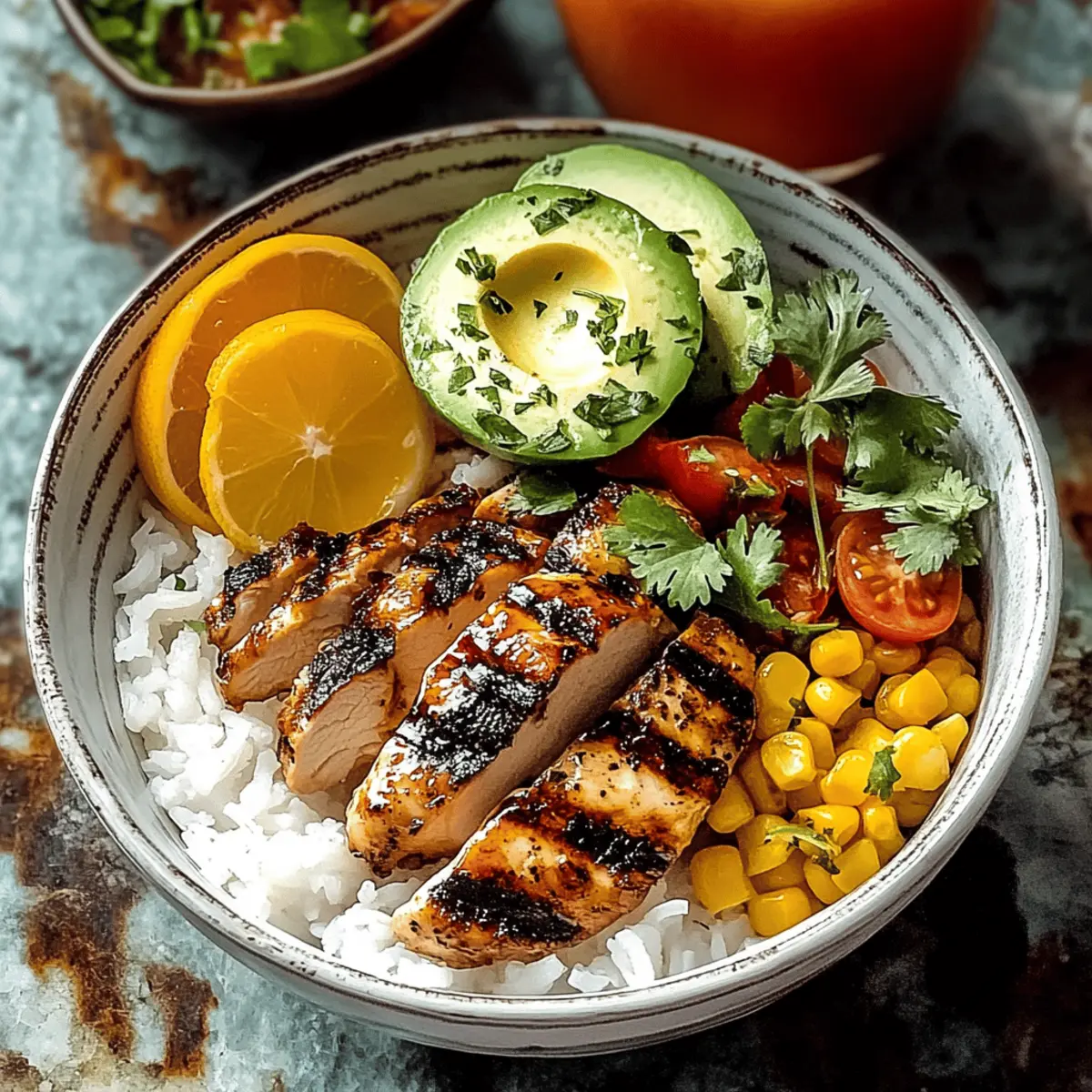 - Serve a portion of rice in bowls, top with sliced chicken, corn and bean mixture, and diced avocado.