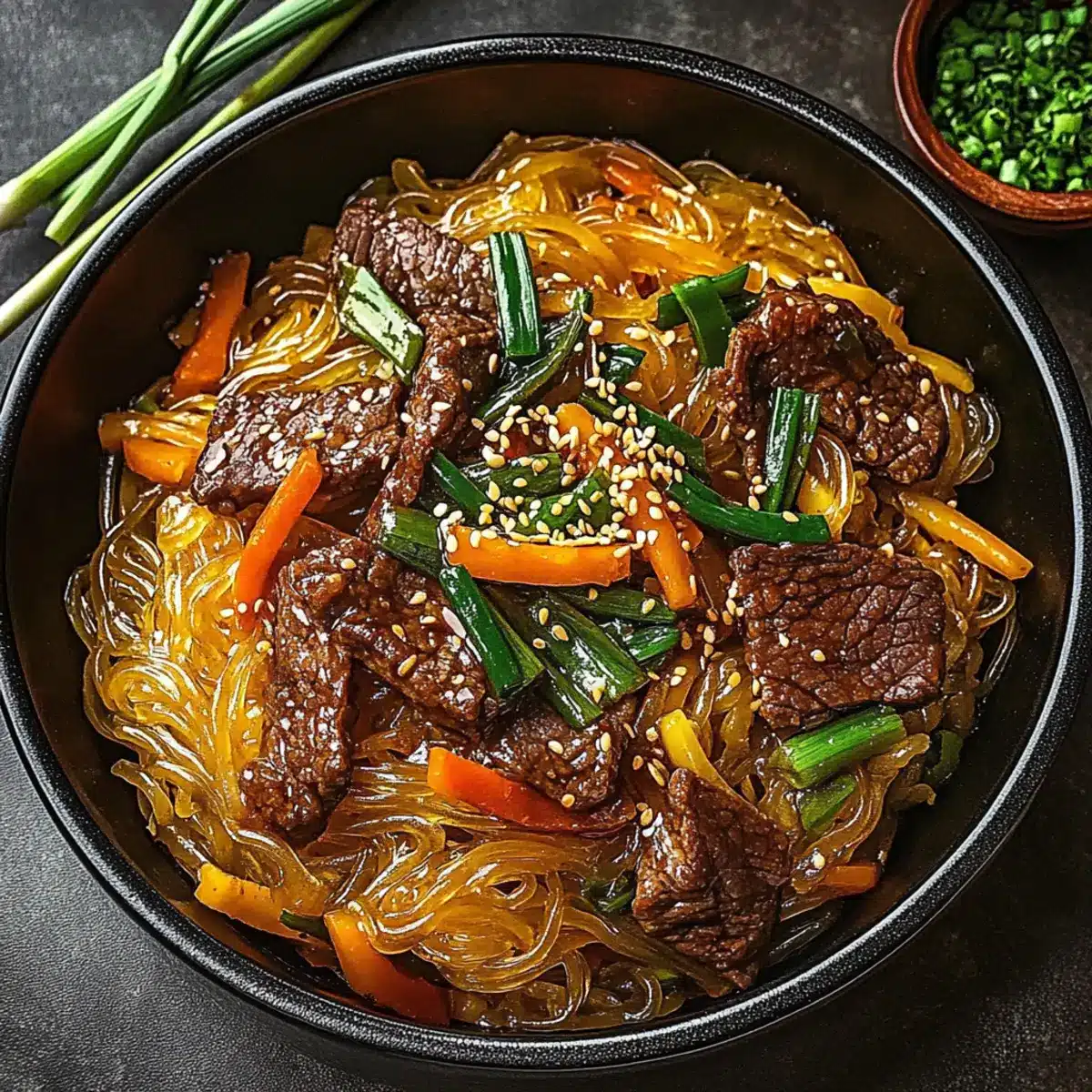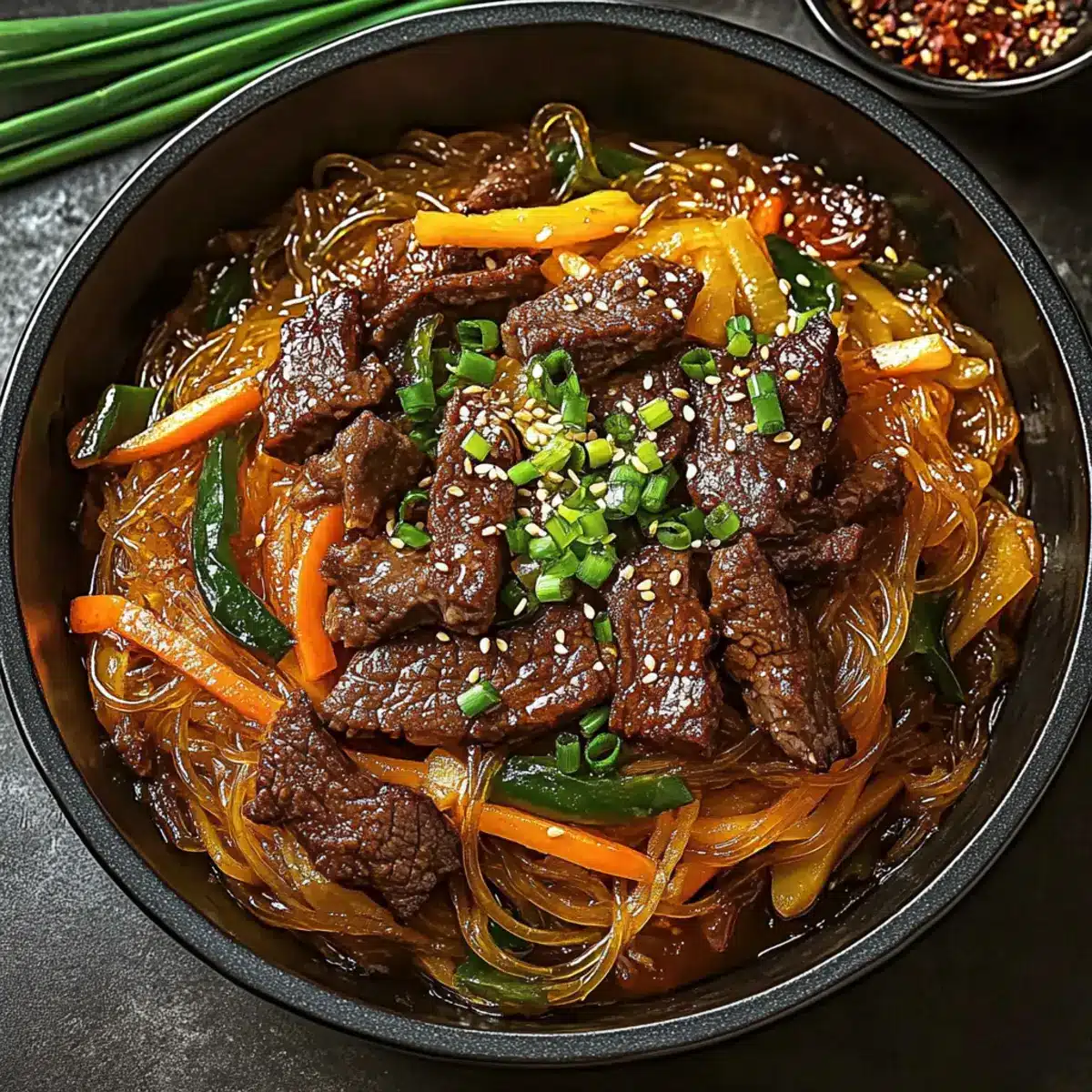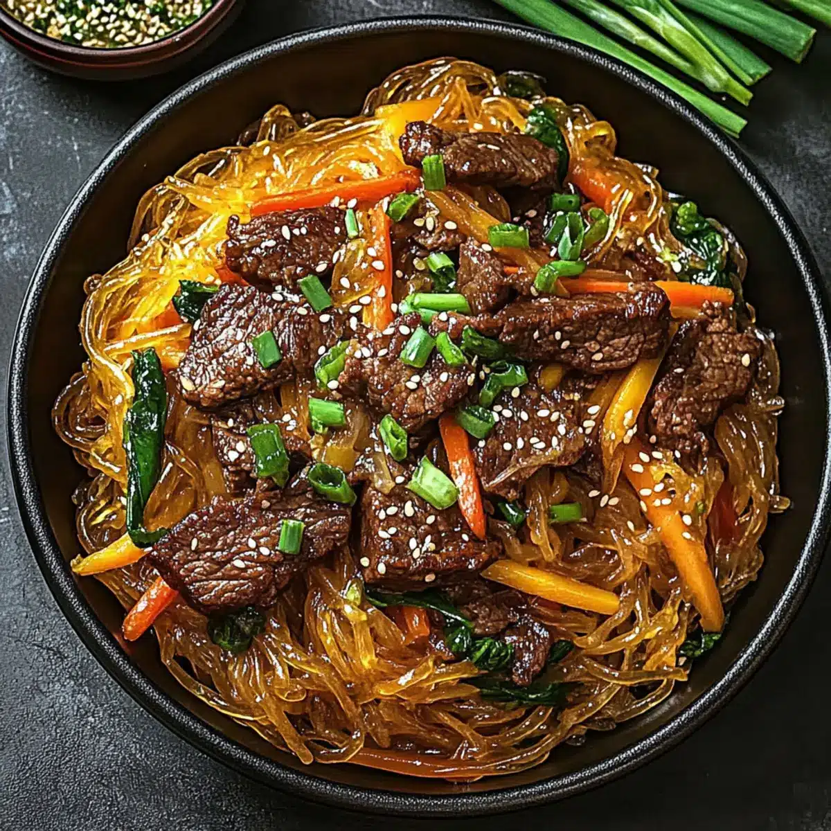 Flavorful Fusion: Japchae brings together the sweet aroma of sweet potato noodles with savory beef and fresh veggies for an unforgettable flavor experience.