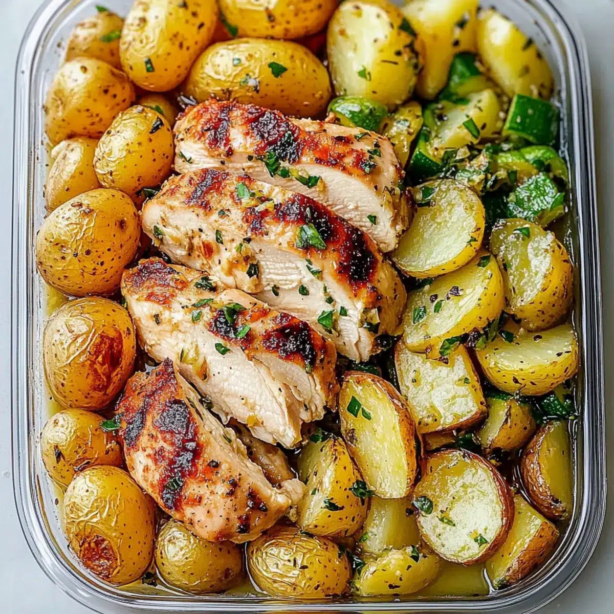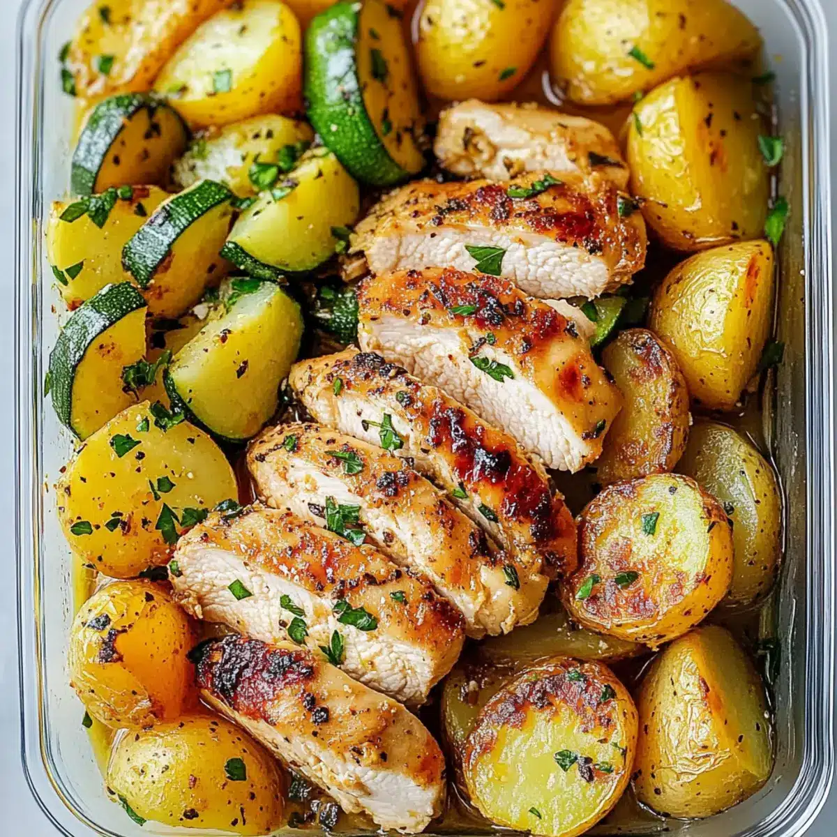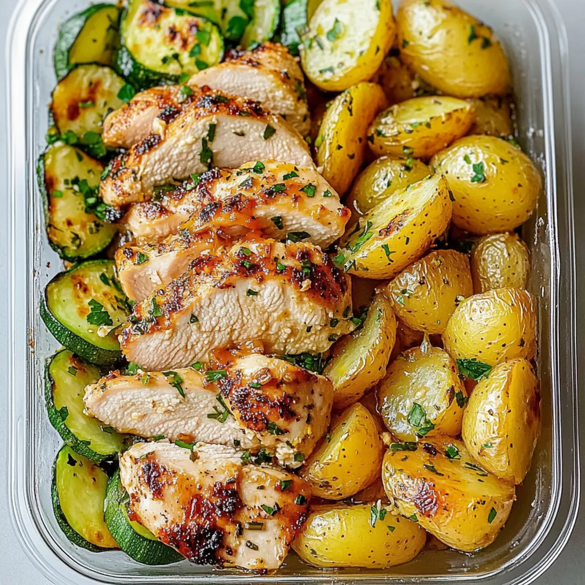 - Assemble meal prep containers with chicken, roasted potatoes, and sautéed zucchini. Store for the week!