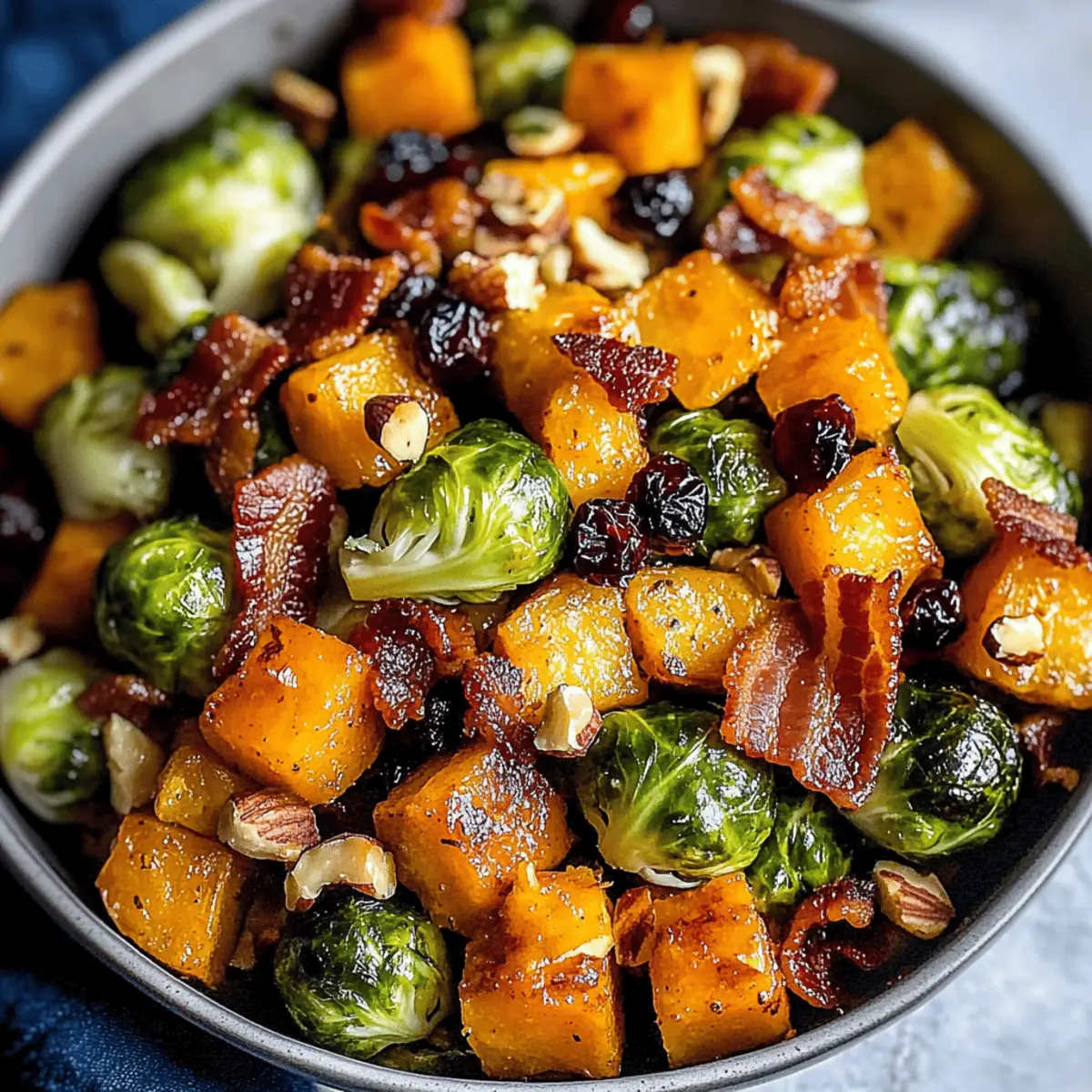 - In a large bowl, combine Brussels sprouts, butternut squash, red onion, and bacon. Pour the glaze over and toss gently.