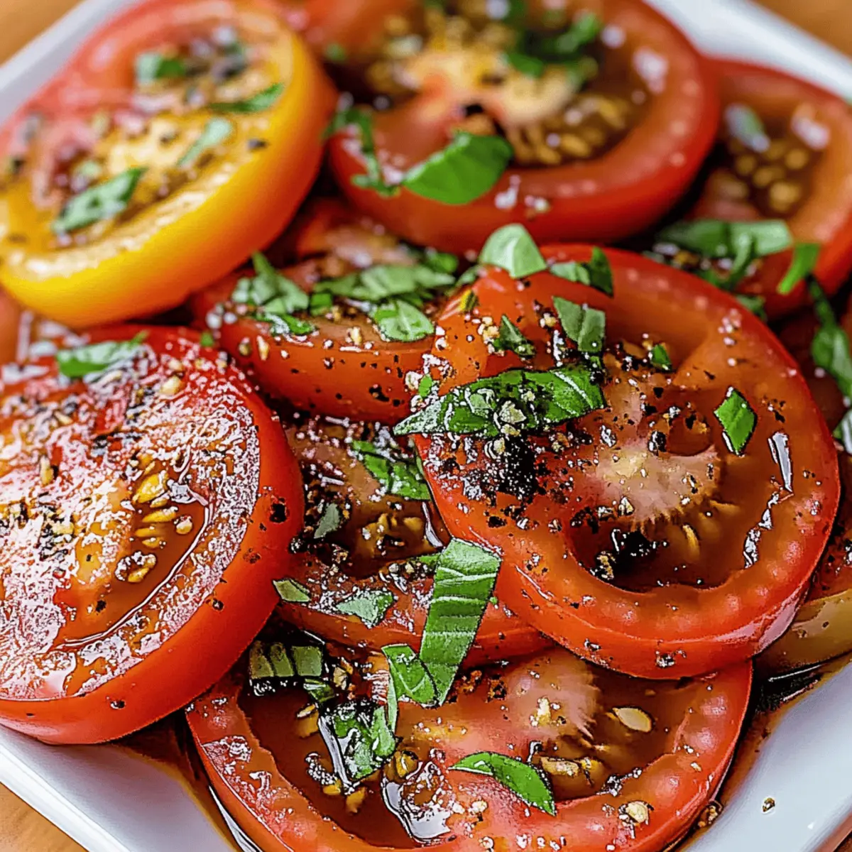 In a medium mixing bowl, whisk together ½ cup of extra virgin olive oil and ¼ cup of balsamic vinegar until well combined. Add in 1 teaspoon of sea salt, ½ teaspoon of freshly ground black pepper, and 2 minced garlic cloves. Toss in a handful of chopped fresh basil and parsley to brighten the mixture, along with optional red pepper flakes for a spicy kick, creating the perfect marinade for your tomatoes.
