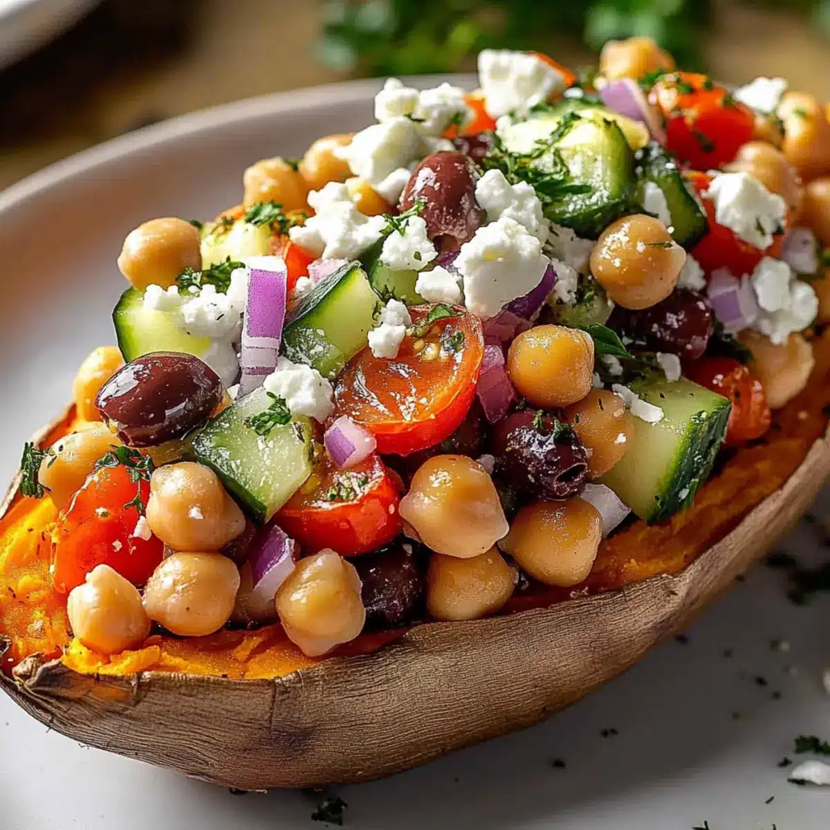 Vibrant flavors: These Mediterranean stuffed sweet potatoes burst with lively tastes from chickpeas, fresh herbs, and tangy feta, giving your palate a delightful experience.