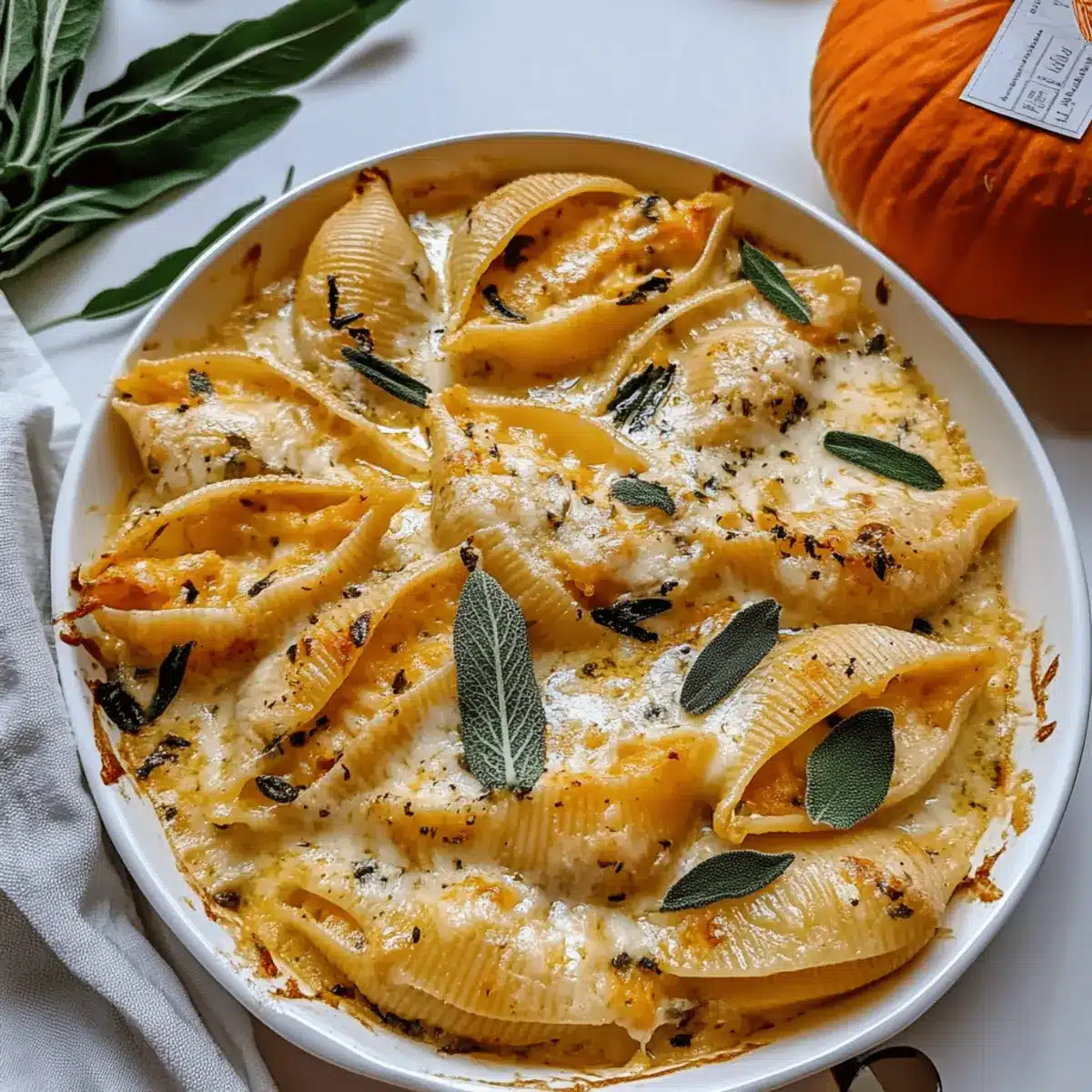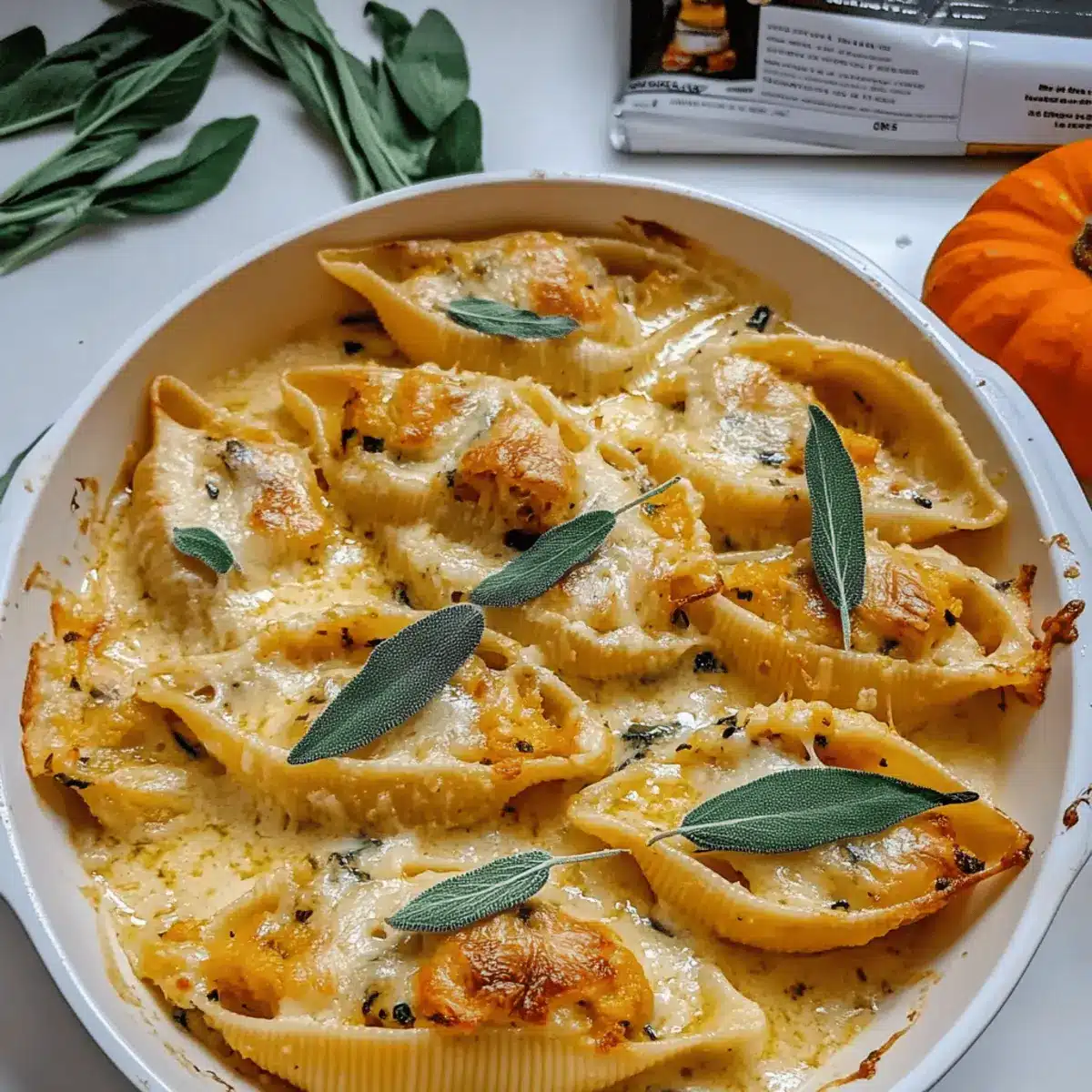 Once baked, remove the dish from the oven and allow it to cool for a moment. Garnish with crispy fried sage leaves and a sprinkle of fresh black pepper for an extra touch of elegance. Your Pumpkin & Gouda Stuffed Shells With Brown Butter & Sage Alfredo Sauce are now ready to impress, serving as a perfect centerpiece for your cozy meal!