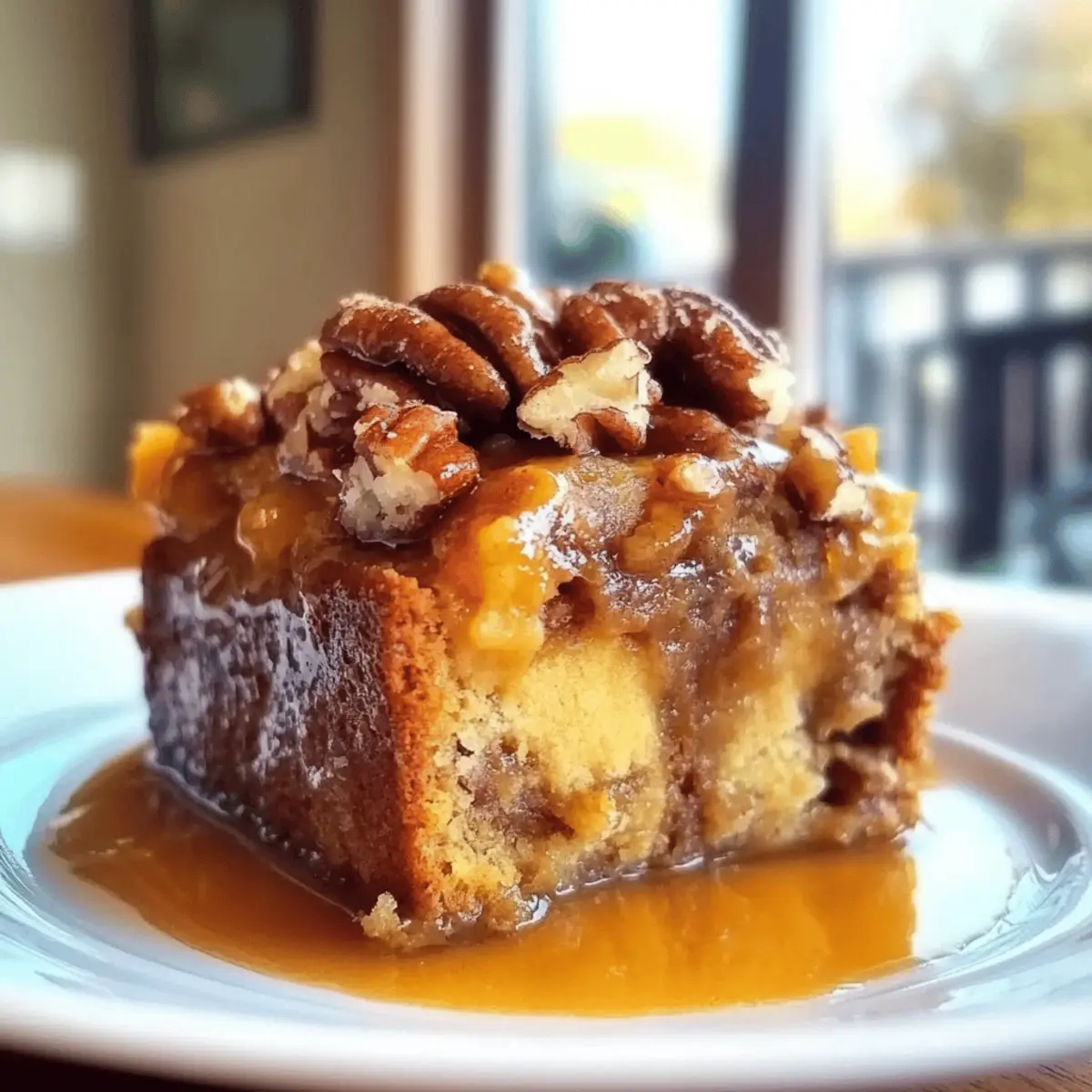 - Remove the pudding from the oven, cool for 10-15 minutes, and drizzle the praline topping before serving.