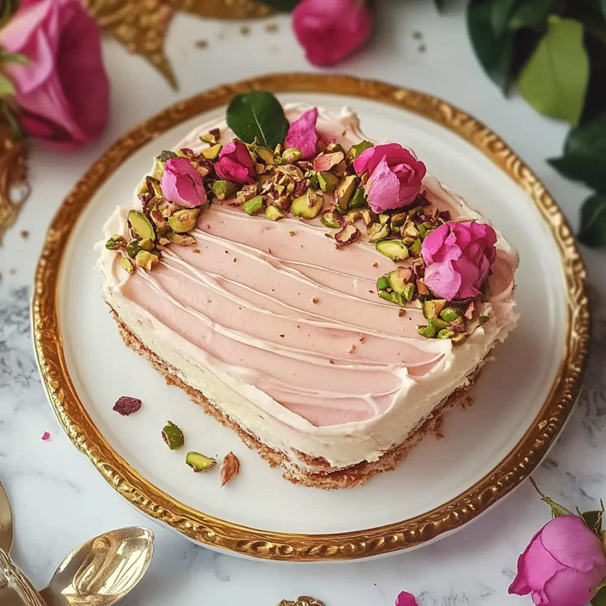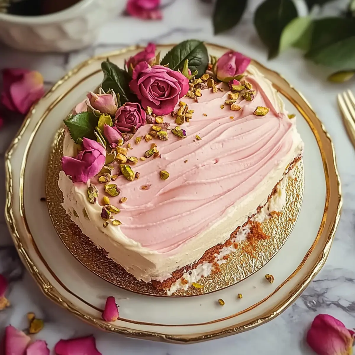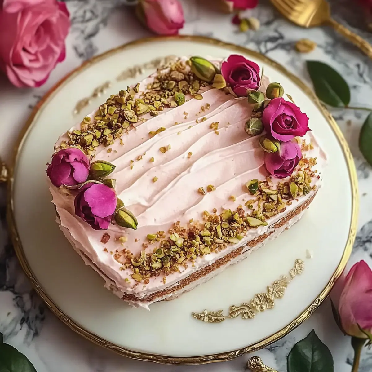 Serving: After chilling, feel free to dress it up with fresh decorations like rose buds or pistachios right before serving for a stunning presentation.