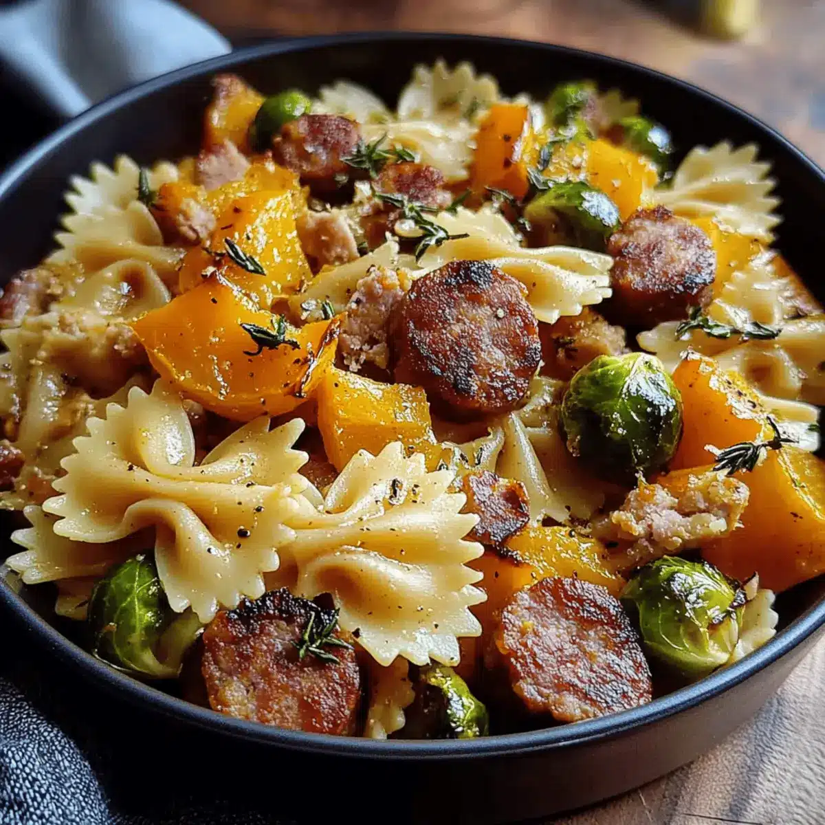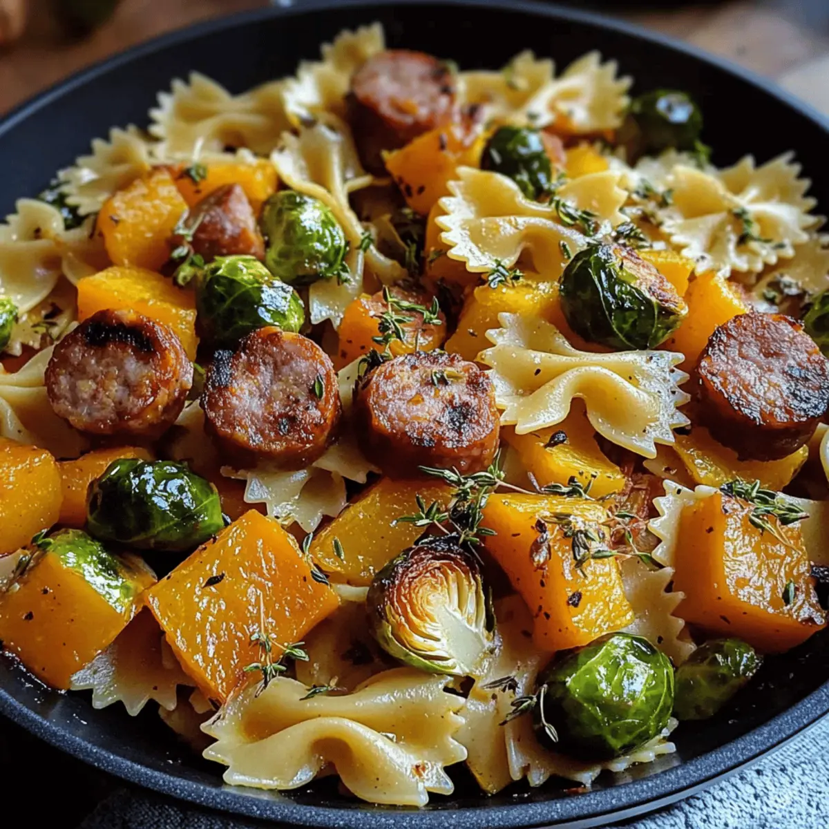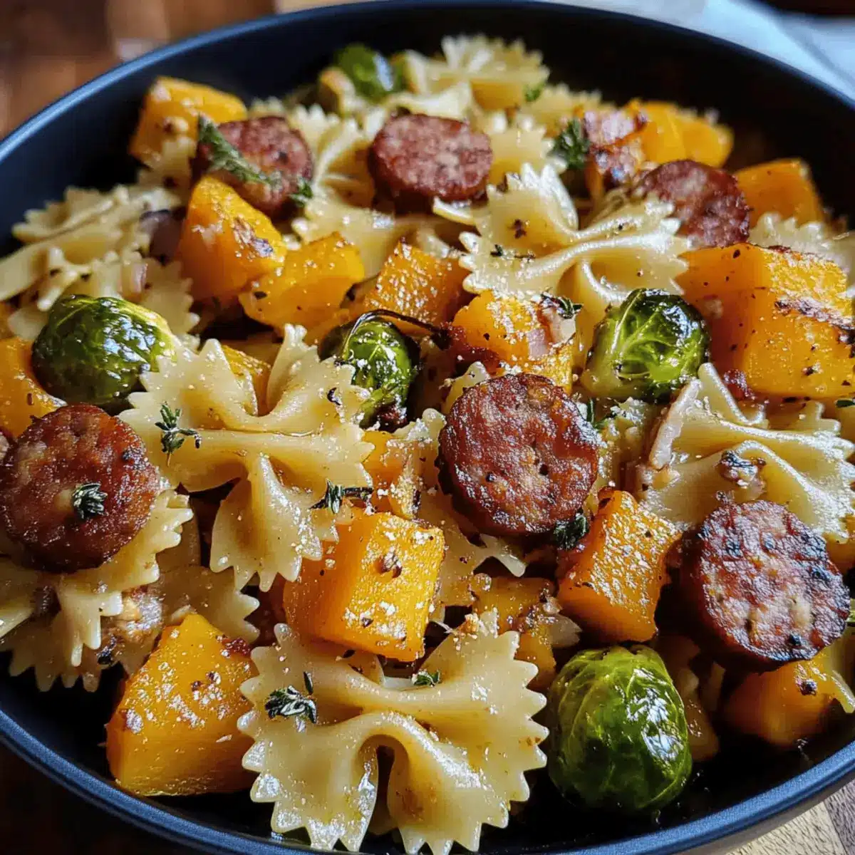 Add the drained pasta to the skillet, followed by the roasted butternut squash, Brussels sprouts, and browned sausage. Sprinkle in salt, pepper, and smoked paprika, stirring gently to combine everything. Pour in a splash of reserved pasta water to loosen the mixture if needed.