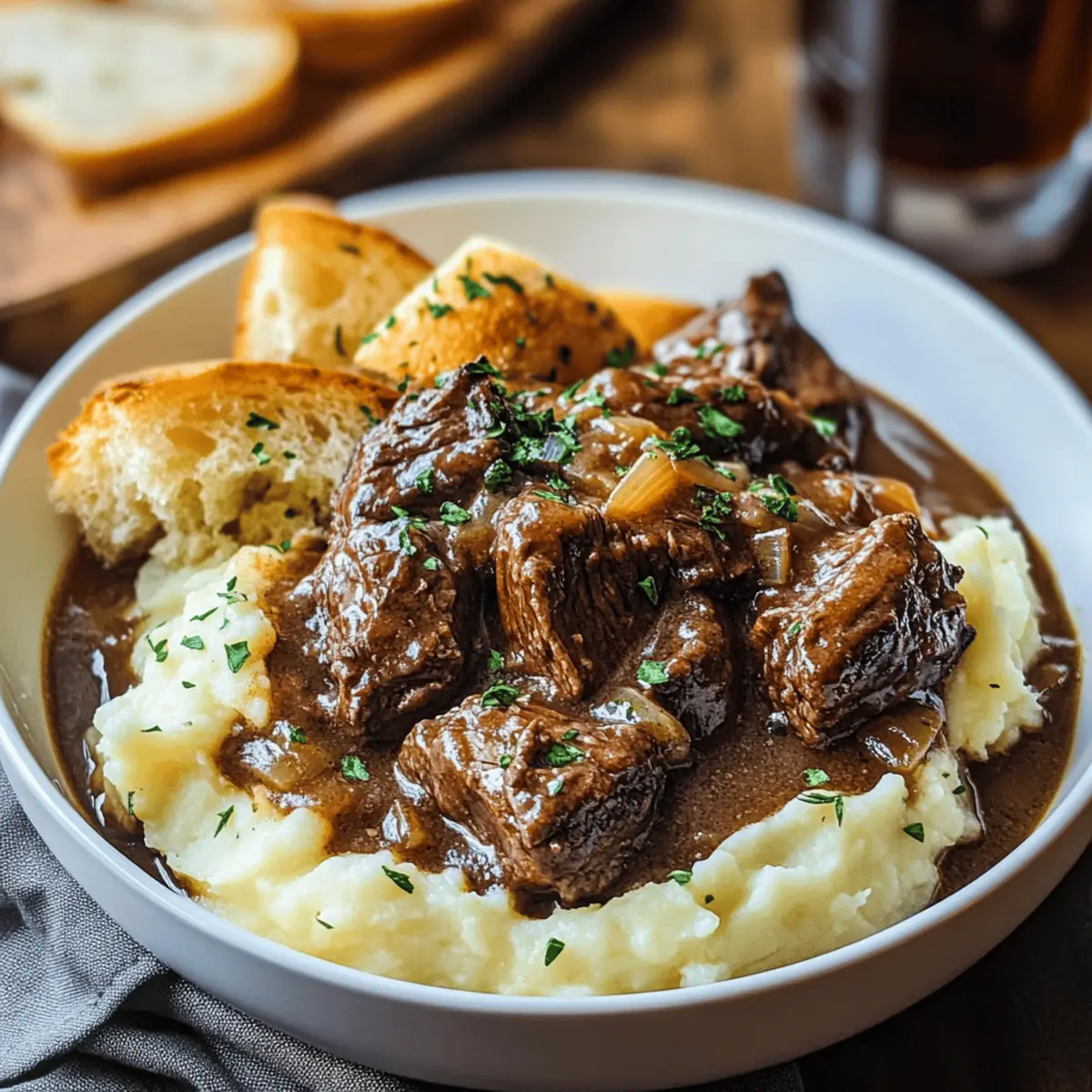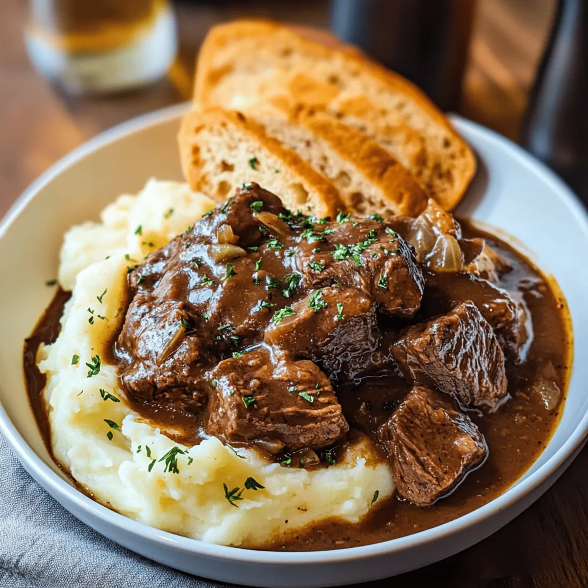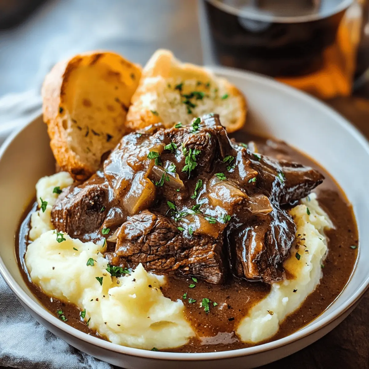 When the beef is done cooking, gently stir to combine it with the luscious gravy created in the slow cooker. Serve the tender beef and gravy generously over the warm mashed potatoes, and don’t forget to provide slices of garlic bread on the side. This dish is the epitome of comforting flavor, perfect for a cozy meal.