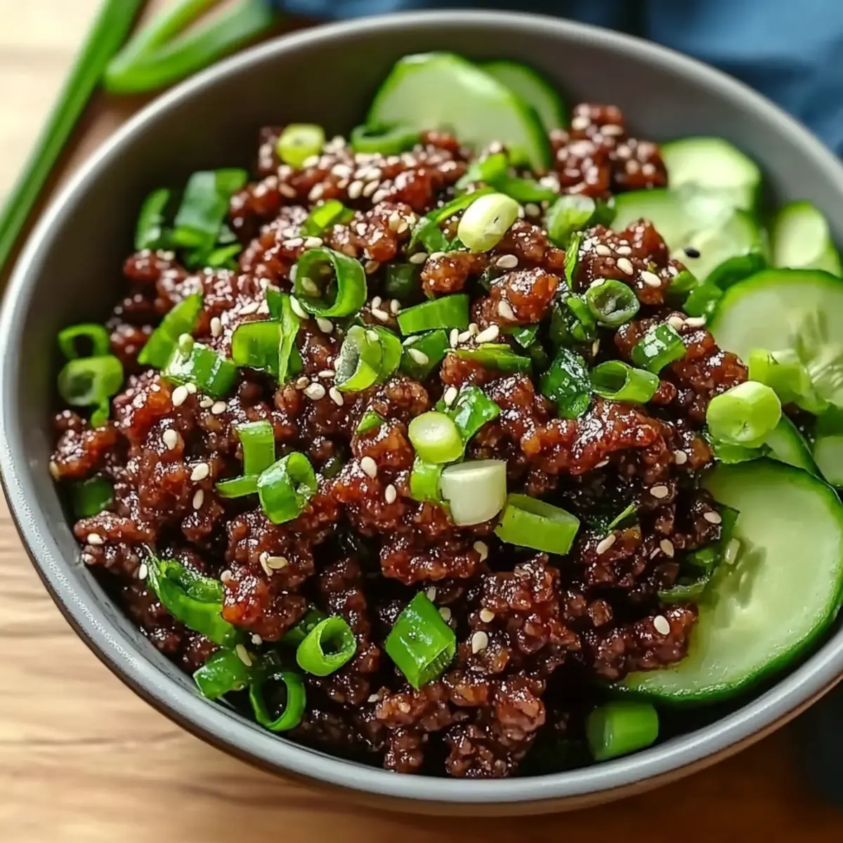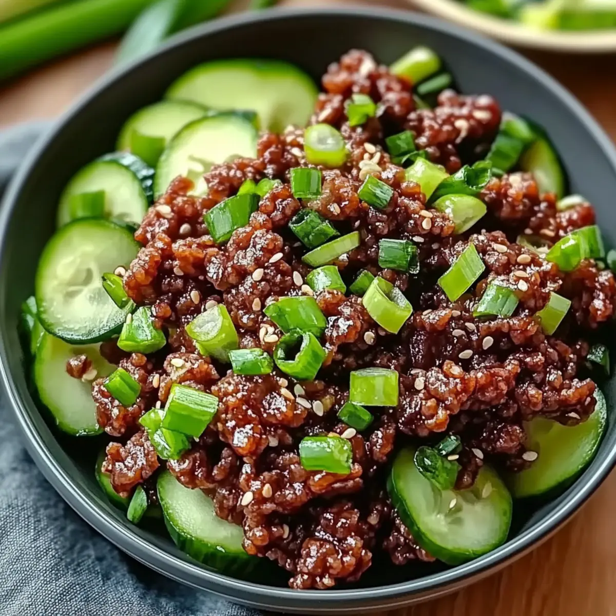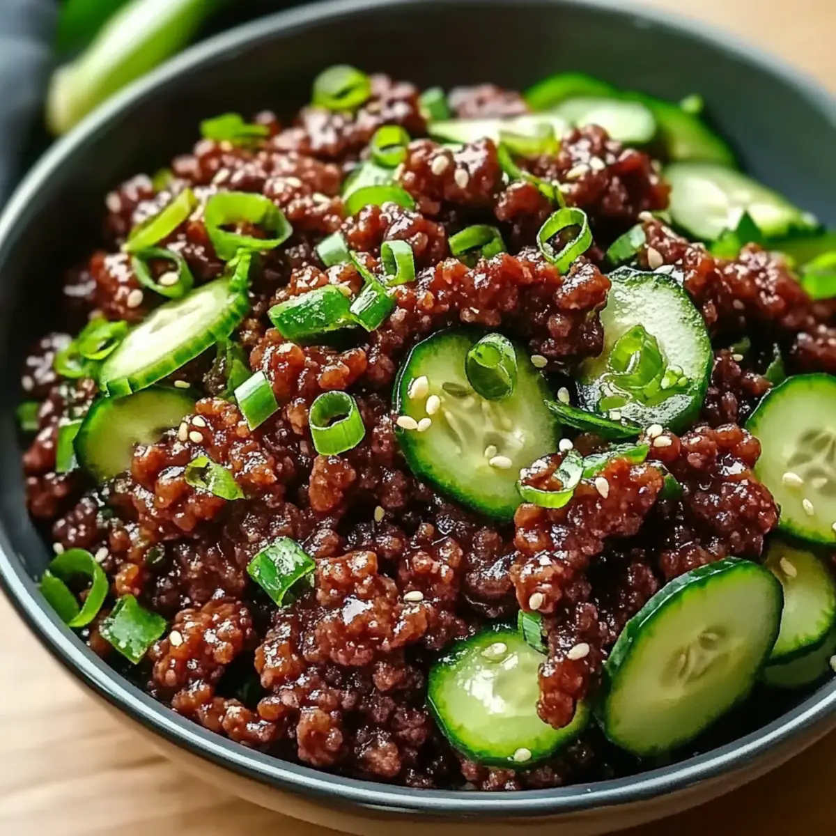 - Serve the spicy beef mixture over the cucumber salad. Garnish with additional sesame seeds and green onions.