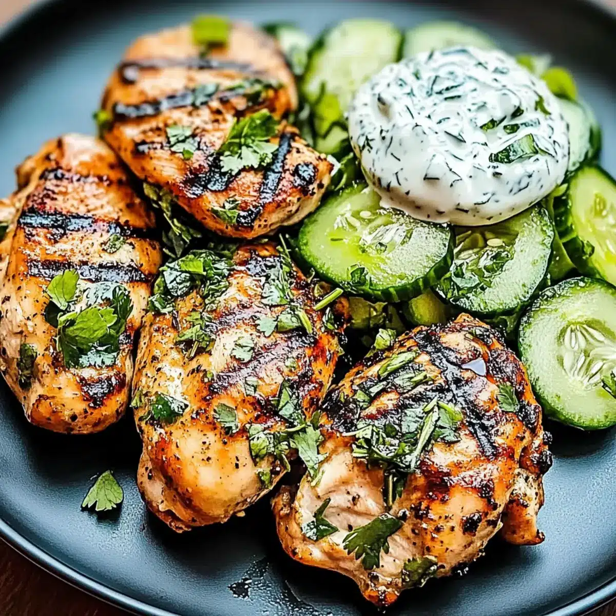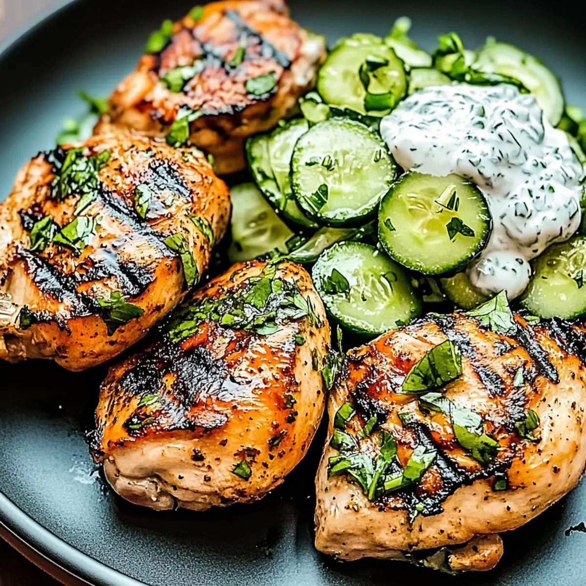 As the chicken grills, wash and chop the Persian cucumbers and red onion into bite-sized pieces. In a separate bowl, mix plain Greek yogurt, a squeeze of lemon juice, salt, and fresh dill to create a creamy dressing. Combine the chopped cucumbers and red onion with the dressing just before serving for a refreshing contrast to the spicy chicken.