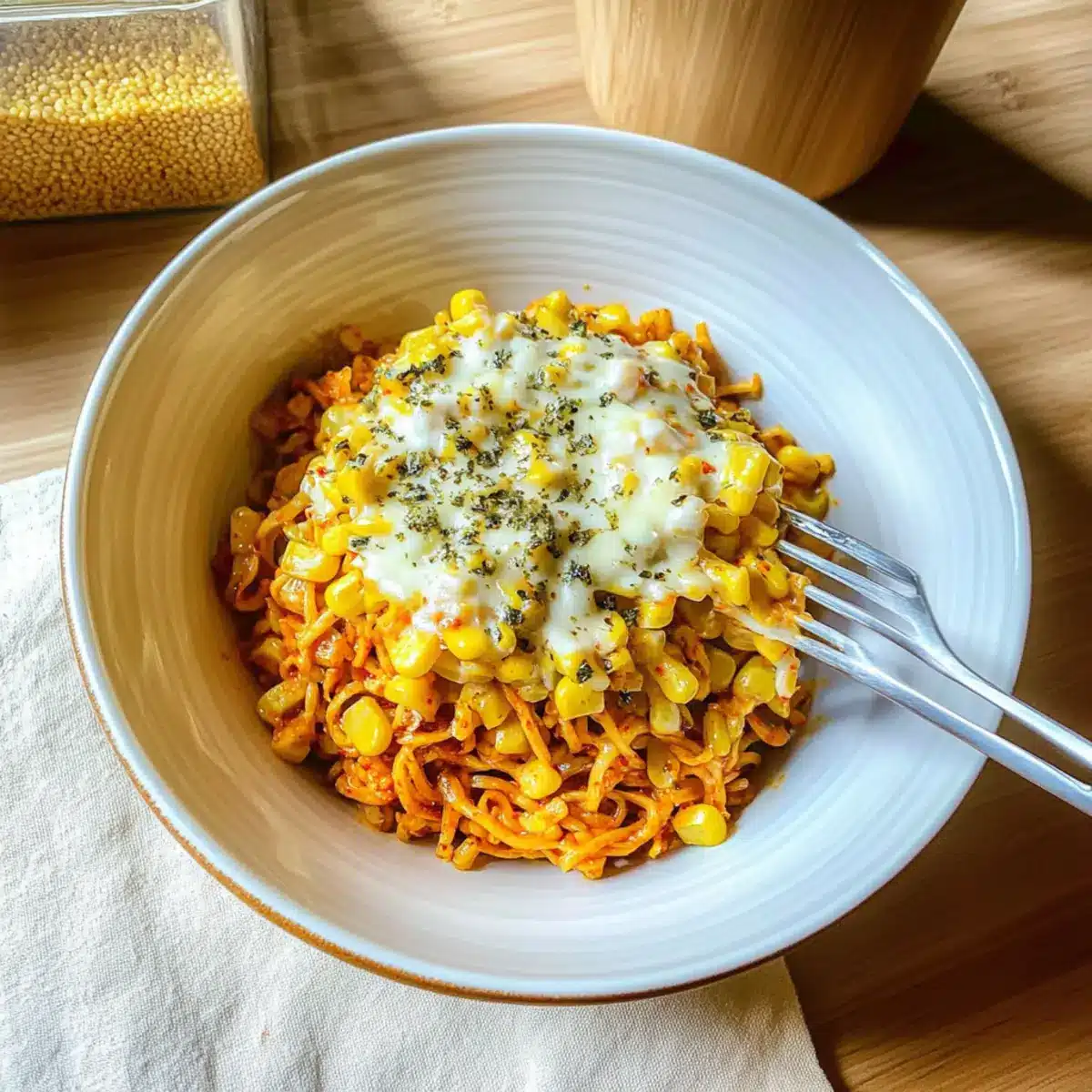 You can easily make your Spicy Noodles With Korean Corn Cheese ahead of time, perfect for meal prep enthusiasts! Prepare the corn cheese topping by cooking the corn with the cheeses, mayo, and sugar, then let it cool before transferring it to an airtight container. This dish can be prepped up to 3 days in advance and stored in the refrigerator. Simply cook the Samyang noodles on the day of serving and reheat the corn cheese mixture on the stovetop or microwave (adding a splash of water to avoid dryness). Just remember to combine them right before serving for that fresh, comforting flavor that makes this dish so irresistible!