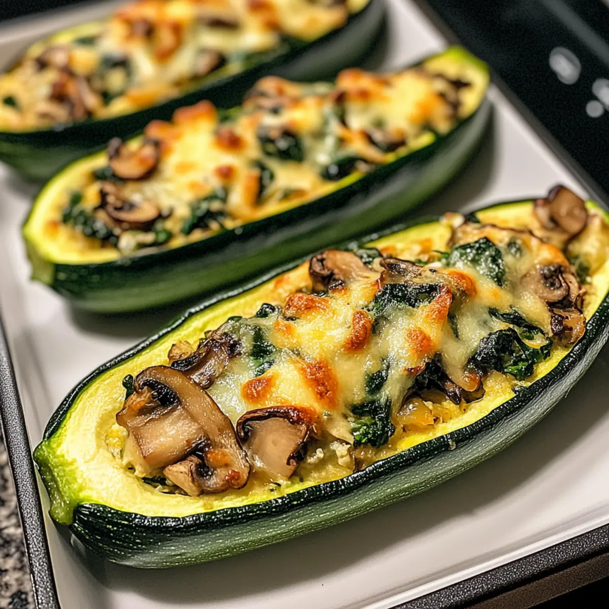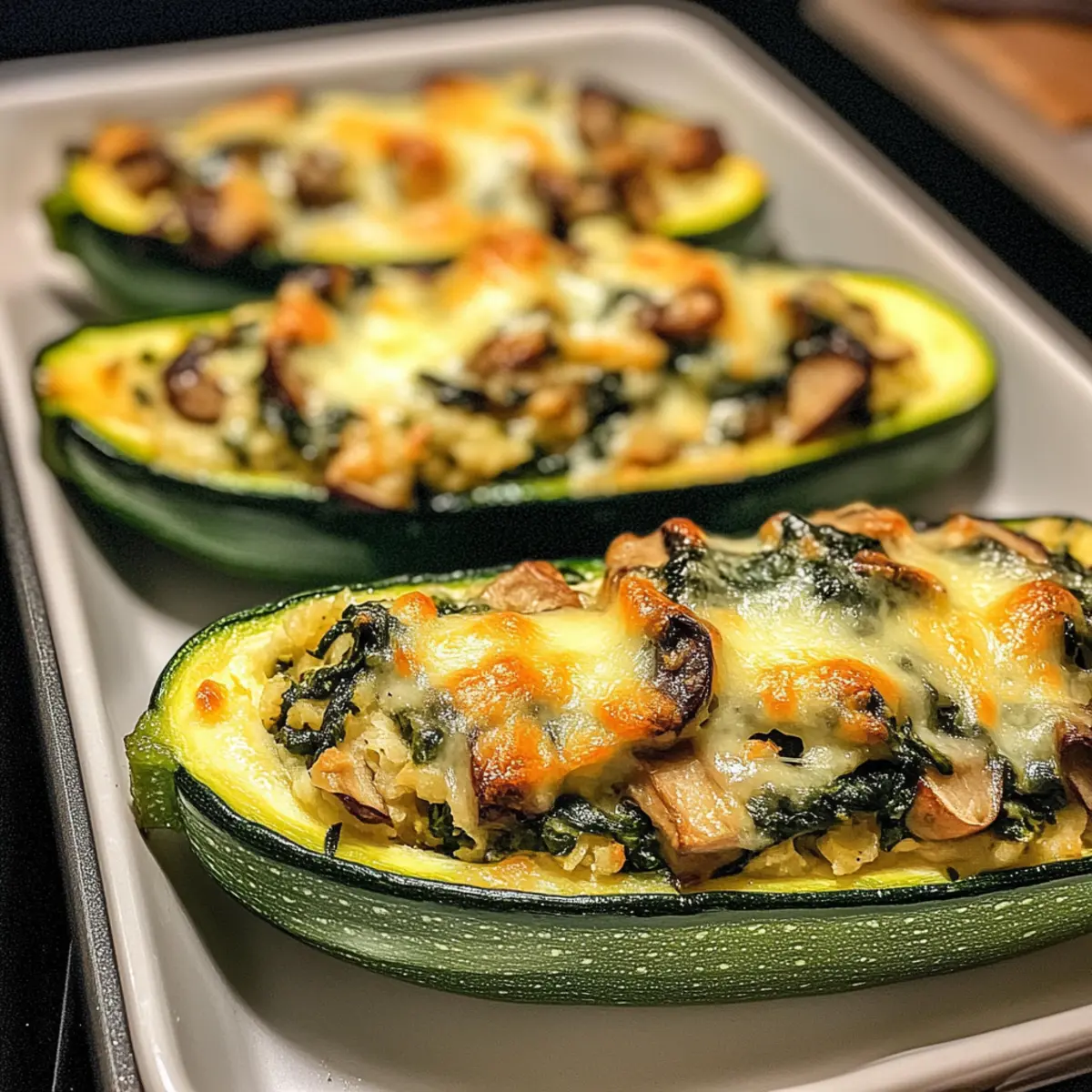 Slide the tray into the preheated oven and bake your Spinach, Mushroom, and Ricotta Stuffed Zucchini Boats for 20-25 minutes. Look for the zucchini to become tender and the filling to turn a lovely golden brown on top, indicating that everything is cooked to perfection.
