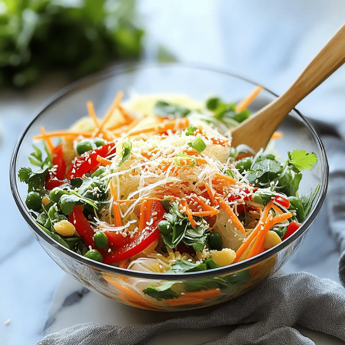 Once the noodles have cooled and you have your fresh vegetable mix ready, gently add the rice vermicelli to the bowl. Using tongs or two forks, toss the ingredients carefully to combine without breaking the noodles, creating a beautiful, cohesive salad ready for the dressing.