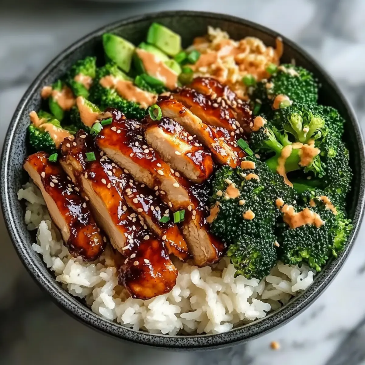 - Assemble the bowls with rice, topped with chicken, broccoli, spicy mayo, and sesame seeds.