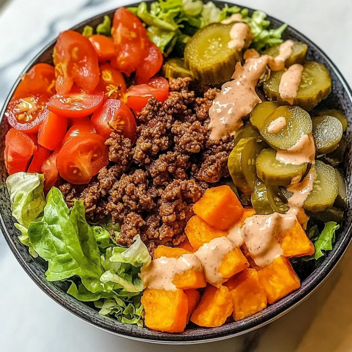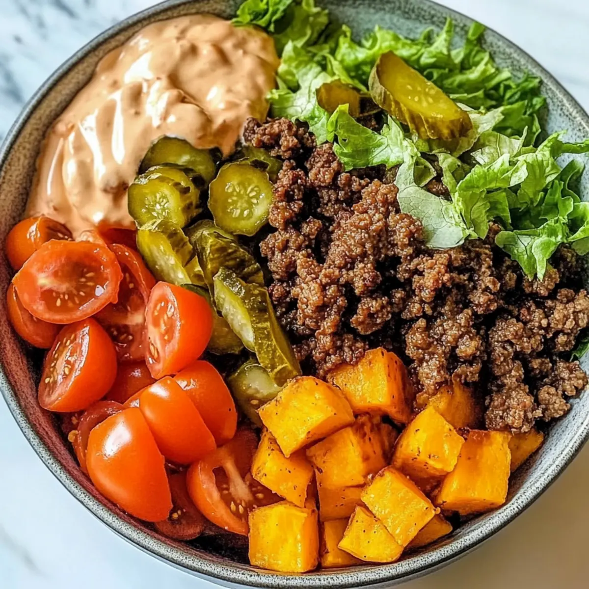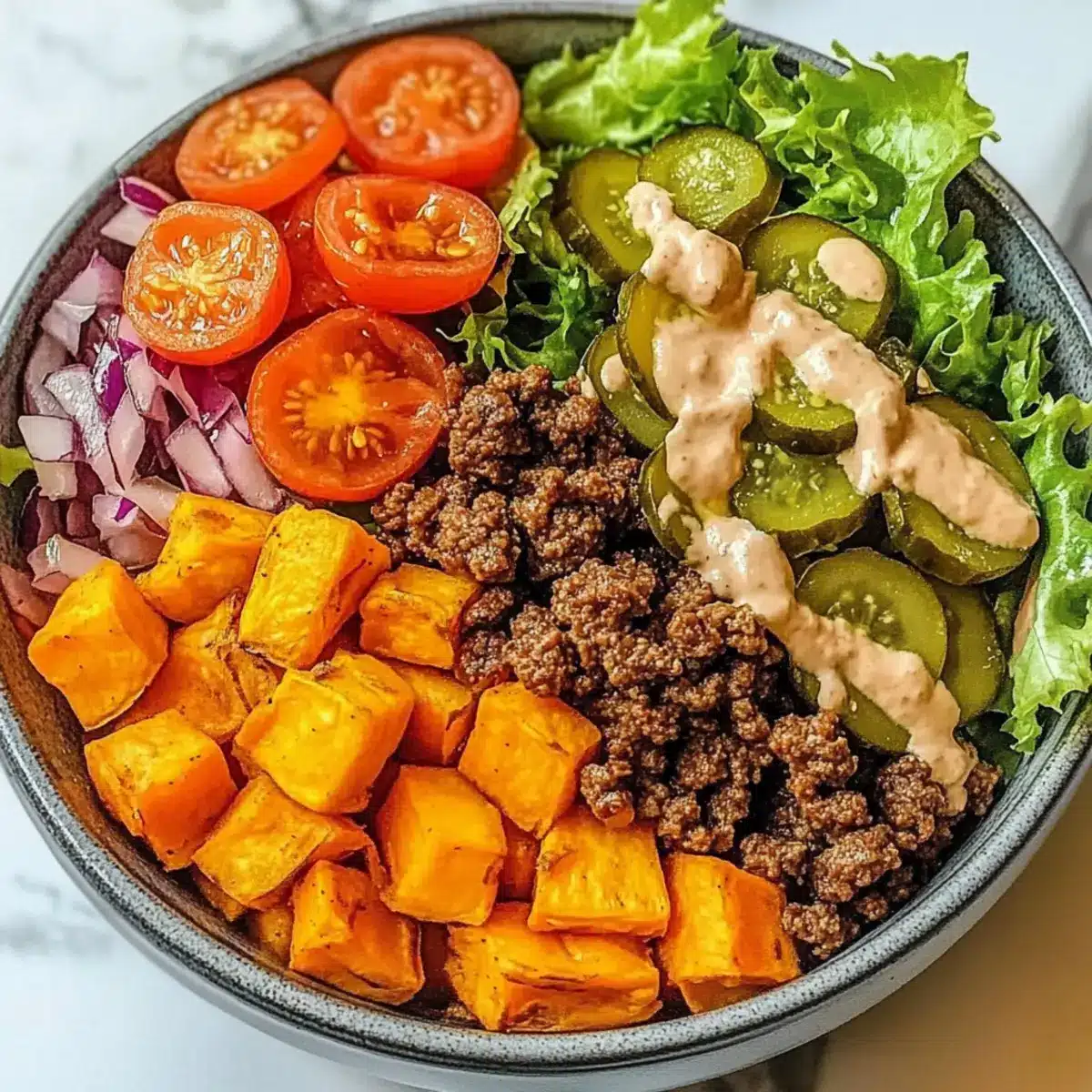 Now it’s time to bring the Sweet Potato Burger Bowl together! Start with a base of fresh shredded lettuce in each bowl. Layer on the roasted sweet potatoes, followed by the seasoned ground beef. Add vibrant toppings like sliced red onions, diced tomatoes, and pickles to create a colorful and appetizing presentation.