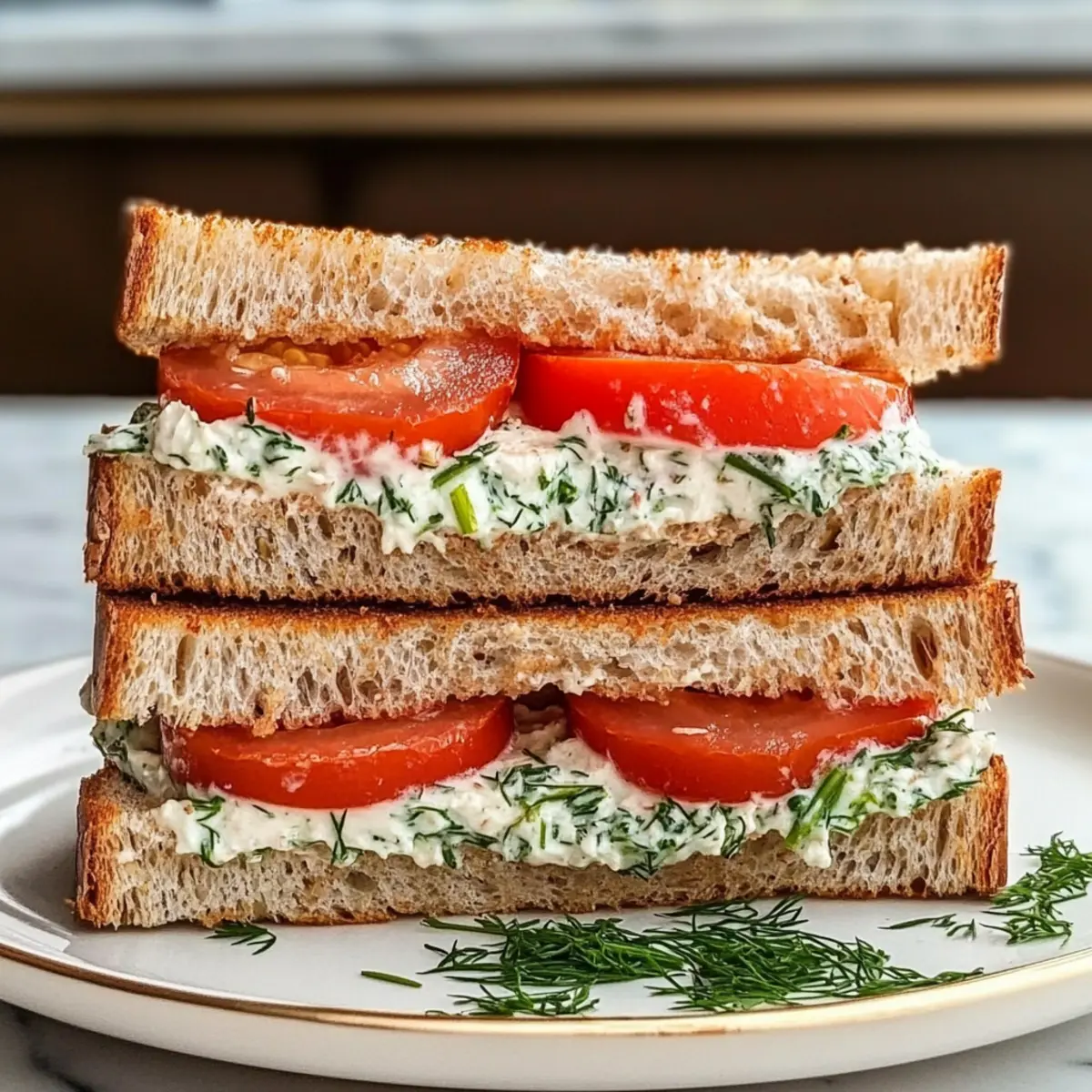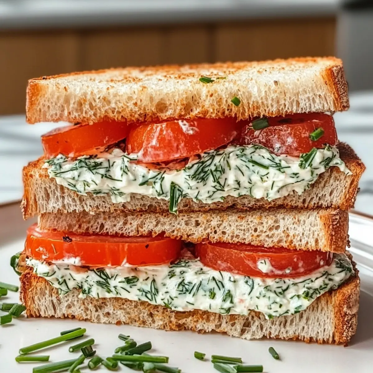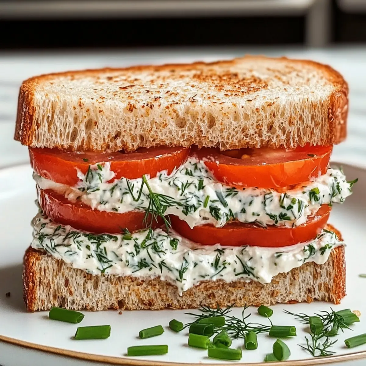 - Assemble the Sandwich: Spread herby cream cheese mixture on one side of each toasted bread slice, layer tomato slices, and top with the other slice.